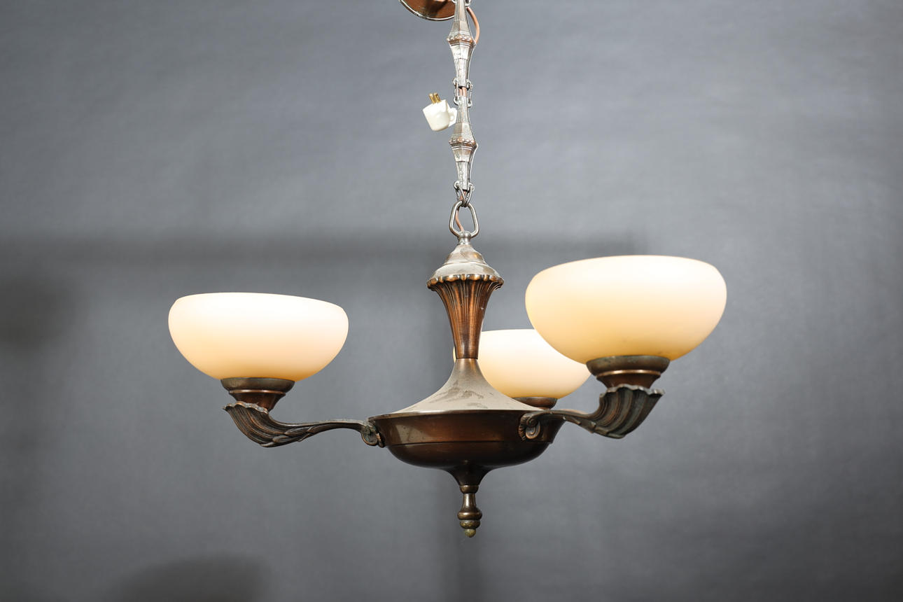 Koppar, med kupor i vit och gul tonat glas. Tre ljuspunkter.