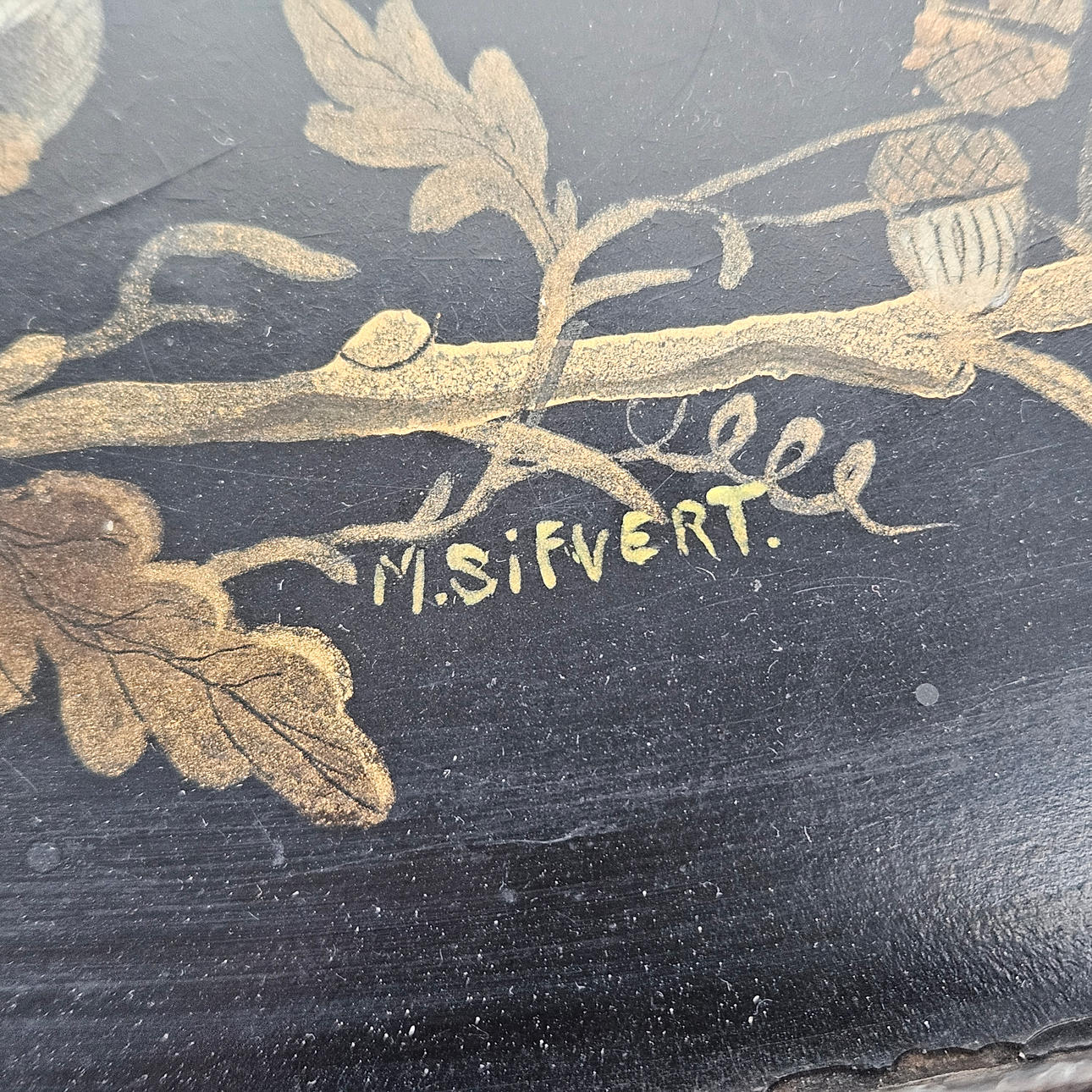 Lackerad bleckplåt, signerad M. Sifvert. Ca. 60x77 cm.