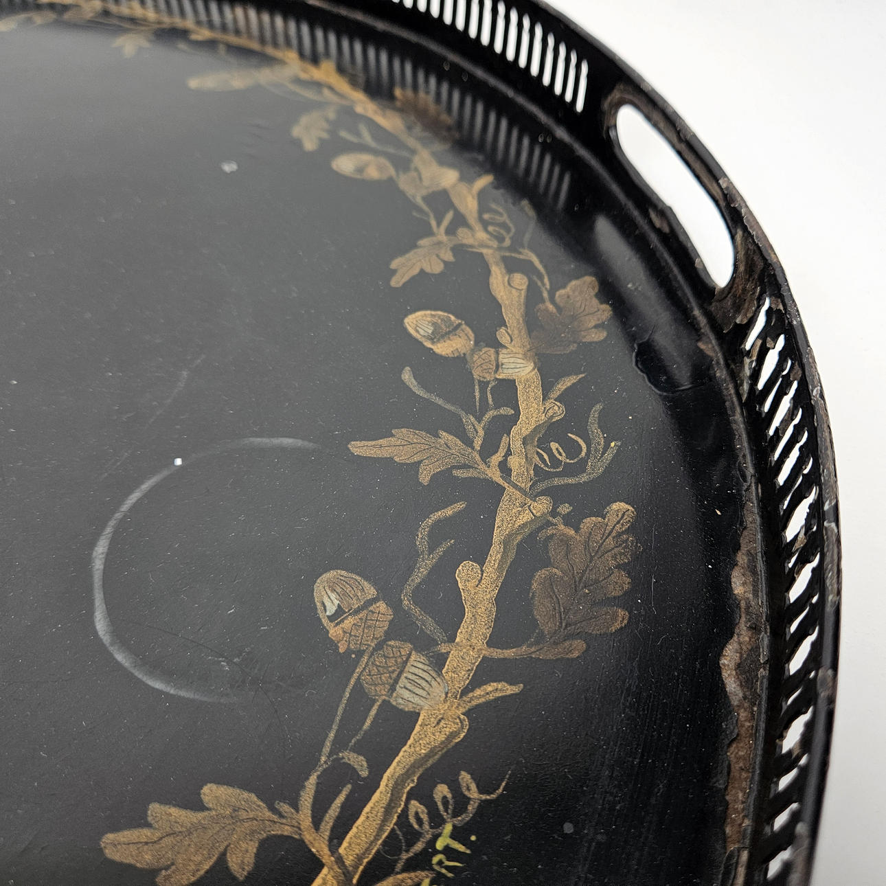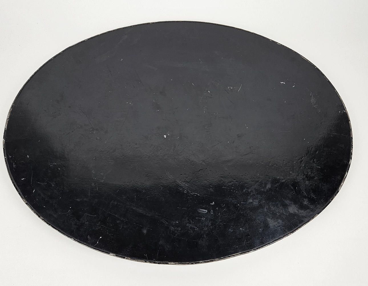 Slitage, fläckar, färgbortfall, sarg med bucklor.
