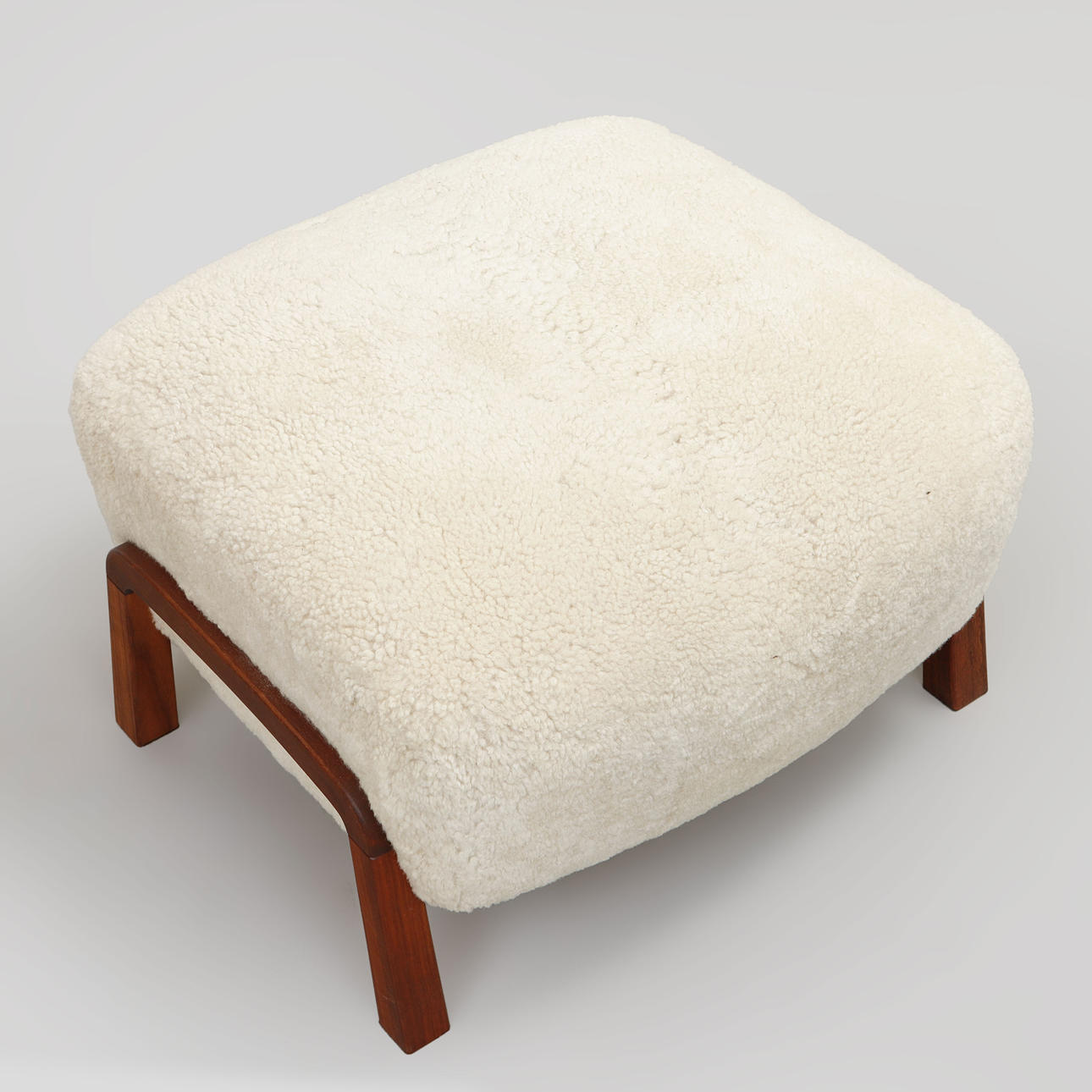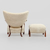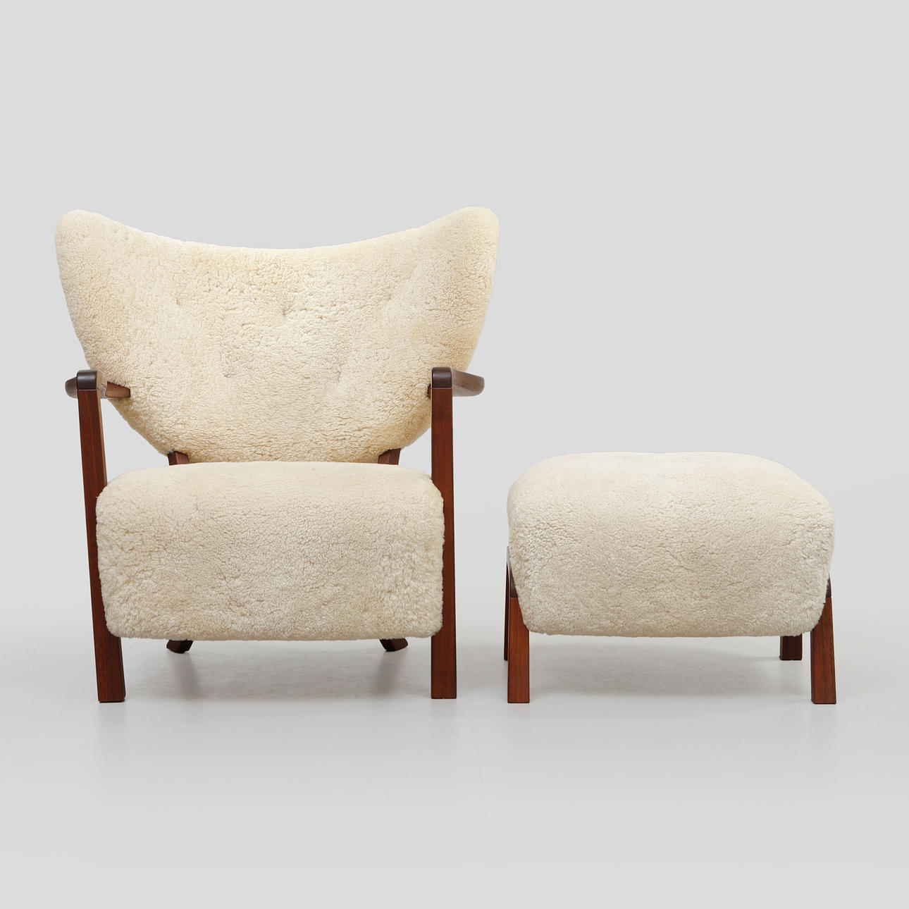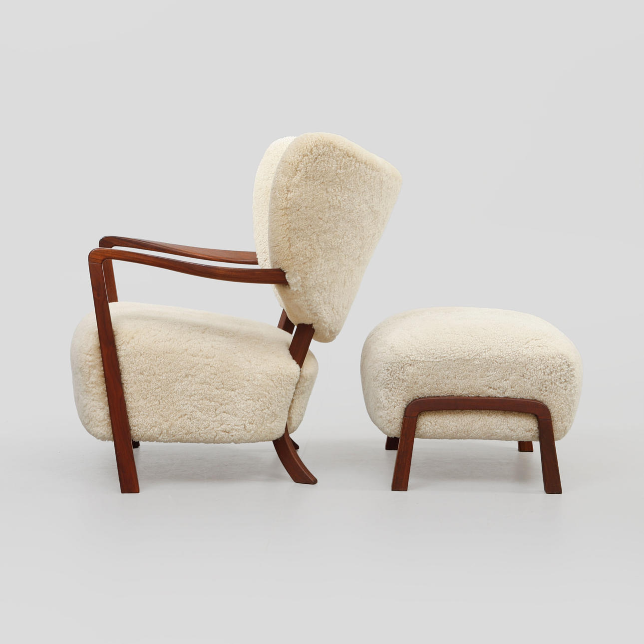 Stomme i valnöt. Klädda i fårskinn. Fåtölj, bredd 85, sitthöjd 40, djup 90, höjd 86 cm. Fotpall, bredd 55, djup 55, höjd 40 cm.