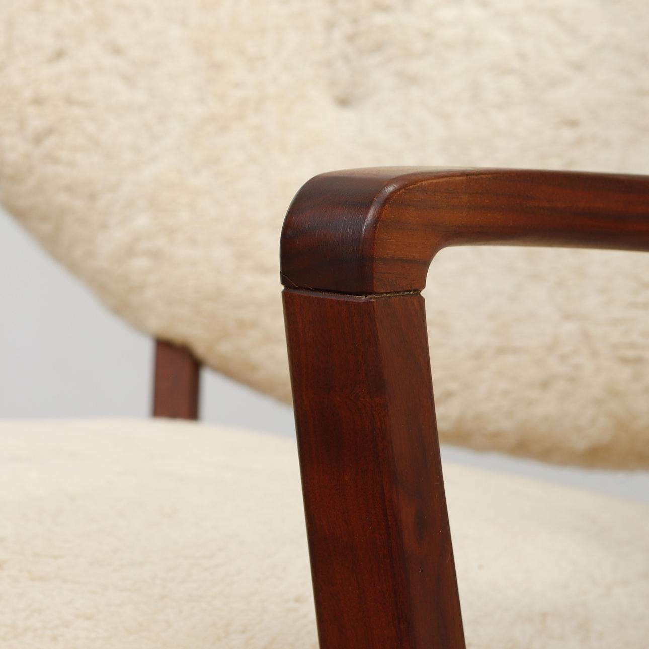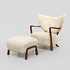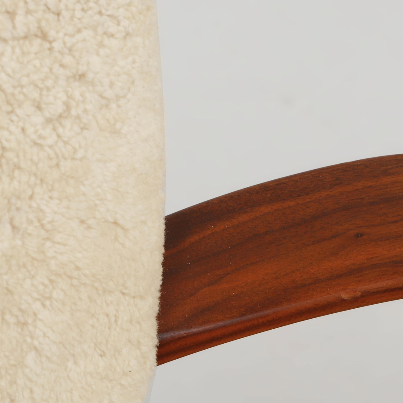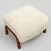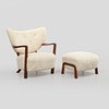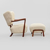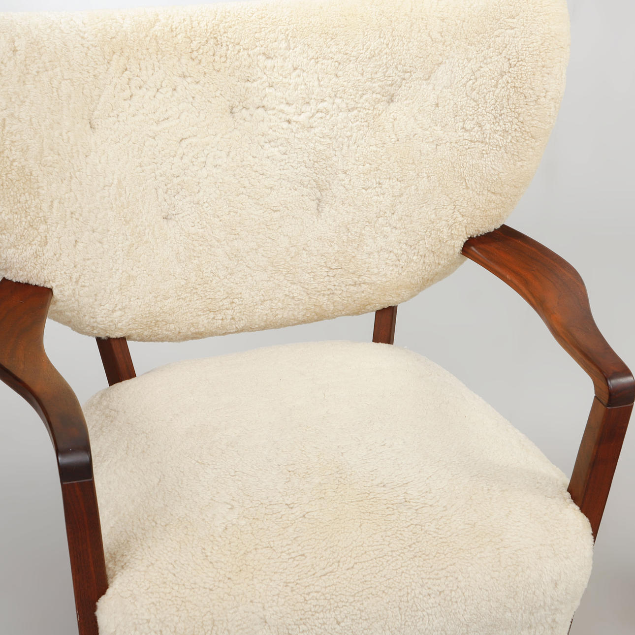 Stomme i valnöt. Klädda i fårskinn. Fåtölj, bredd 85, sitthöjd 40, djup 90, höjd 86 cm. Fotpall, bredd 55, djup 55, höjd 40 cm.