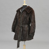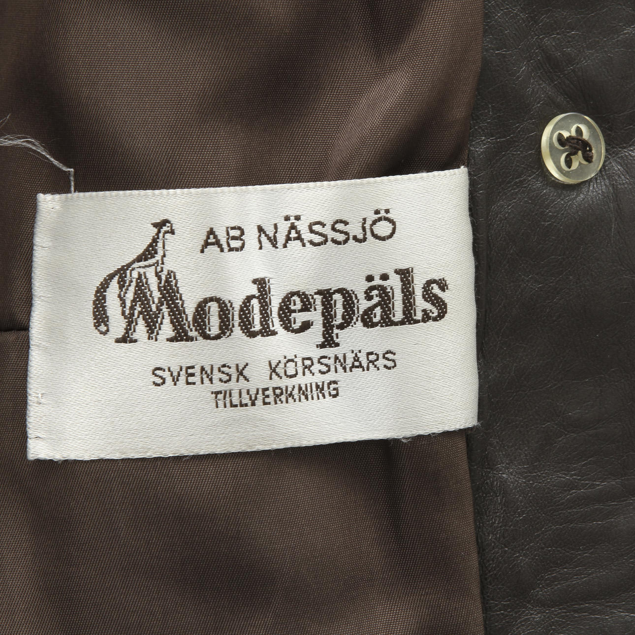 Damjacka med bruna skinndetaljer samt bälte. Etikettmärkt AB Nässjö, Modepäls. Svensk körsnär tillverkning.
