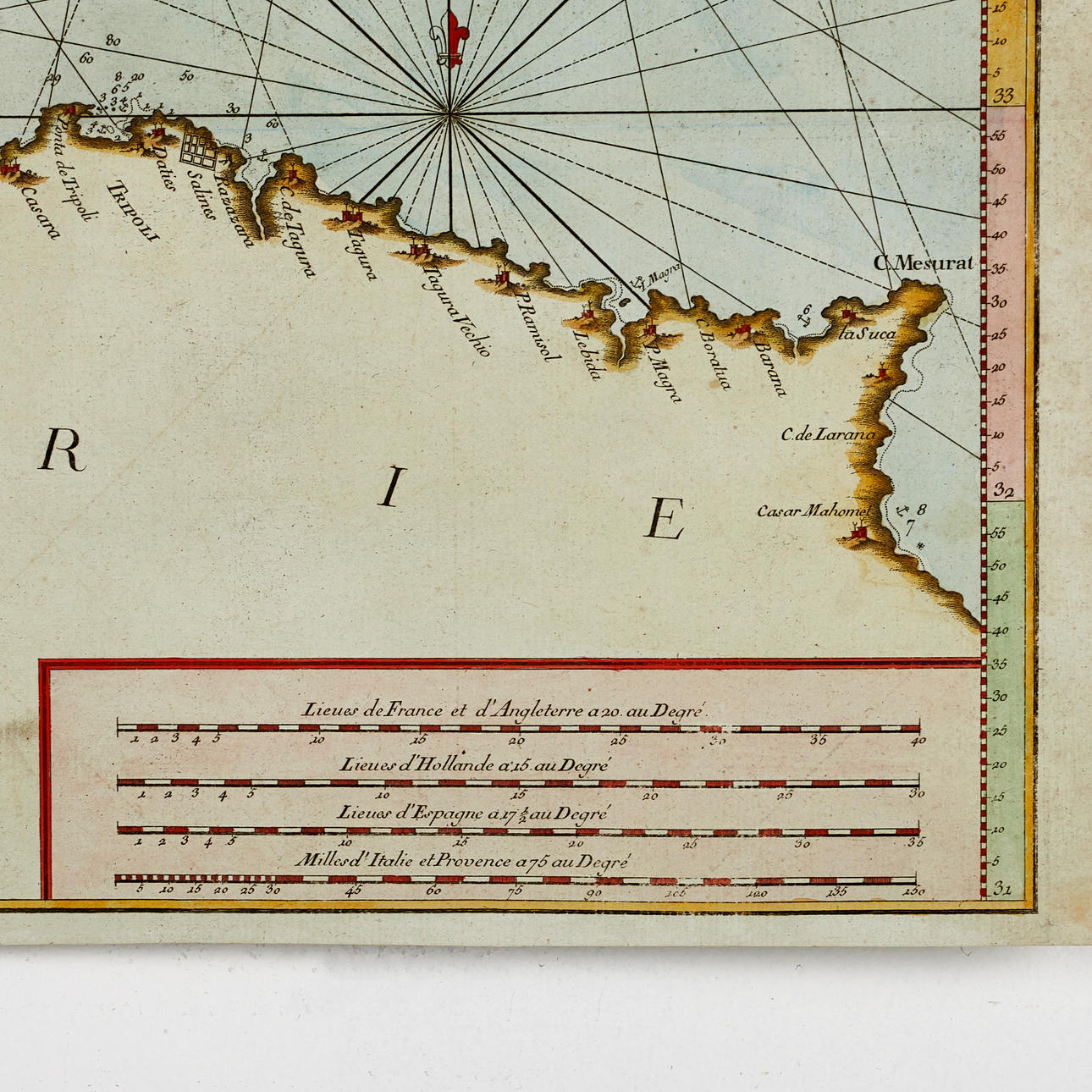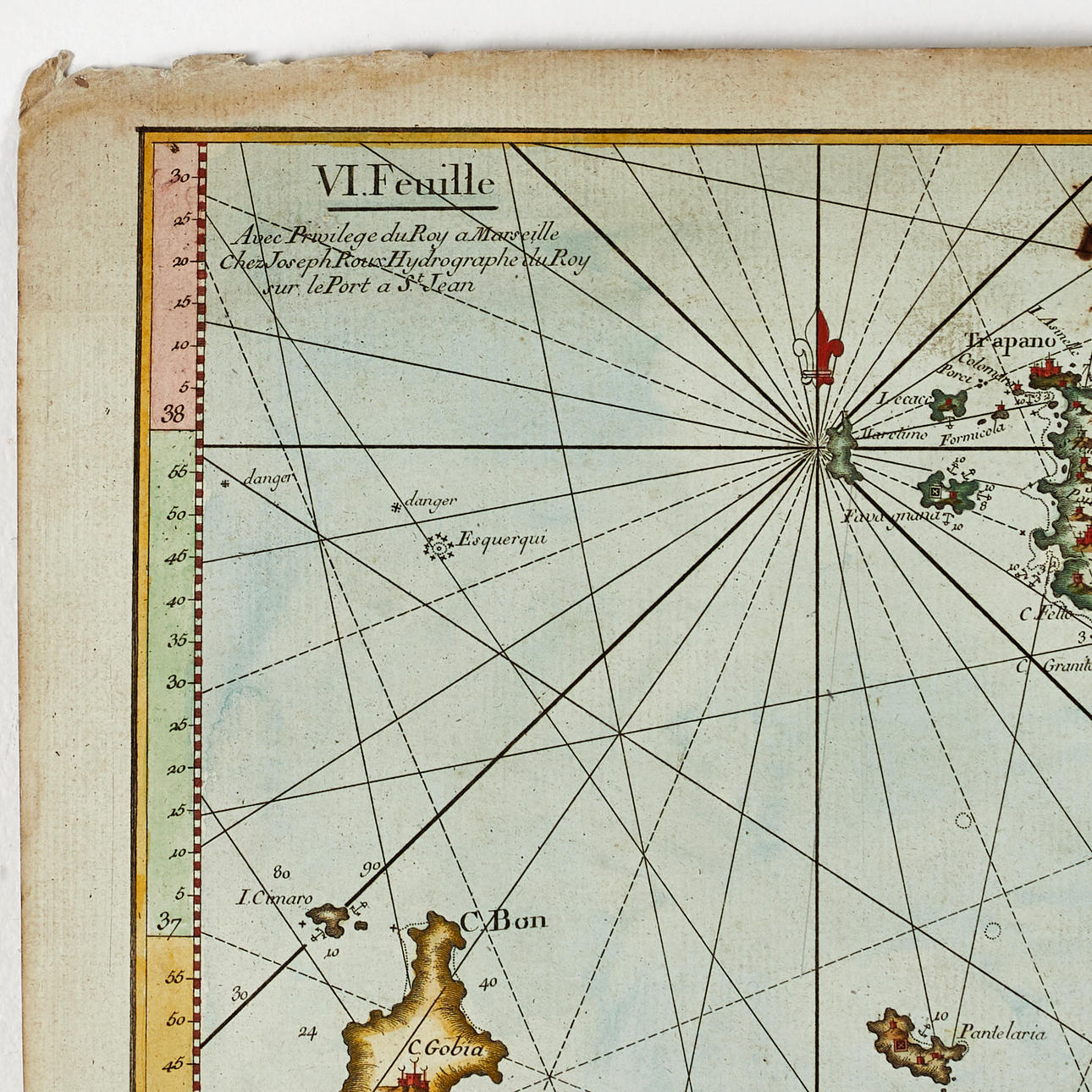Joseph Roux (1725-1793), "VI.e Feuille", ur "Carte de la Mer Mediterranée en Douze Feuilles", graverat och handkolorerat sjökort över Sicilien, Malta samt Nordafrikas kust, 1764.