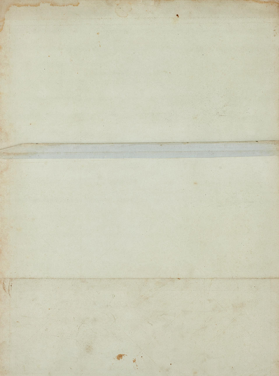 Gulnat, fläckar. Veck i nedre vänstra hörnet. Två horisontella vikveck. Reva (ca 10mm) på bladets vänstra kant. Bladets vänstra kant något ojämnt beskuret. Mindre små skador längs bladets övre kant. Ljusa fuktfläckar i marginalen. Veck och ytsmuts längs bildens övre del.