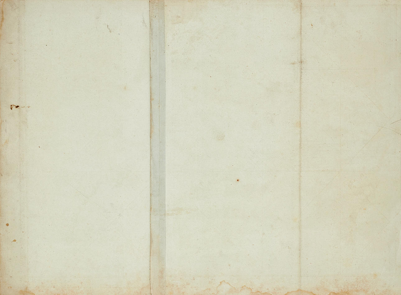 Gulnat, fläckar. Små skador och några små revor (5-8mm) längs bladets kanter. Övre högra hörnet med veck. Två vertikala vikveck. Fuktfläckar i marginalen.