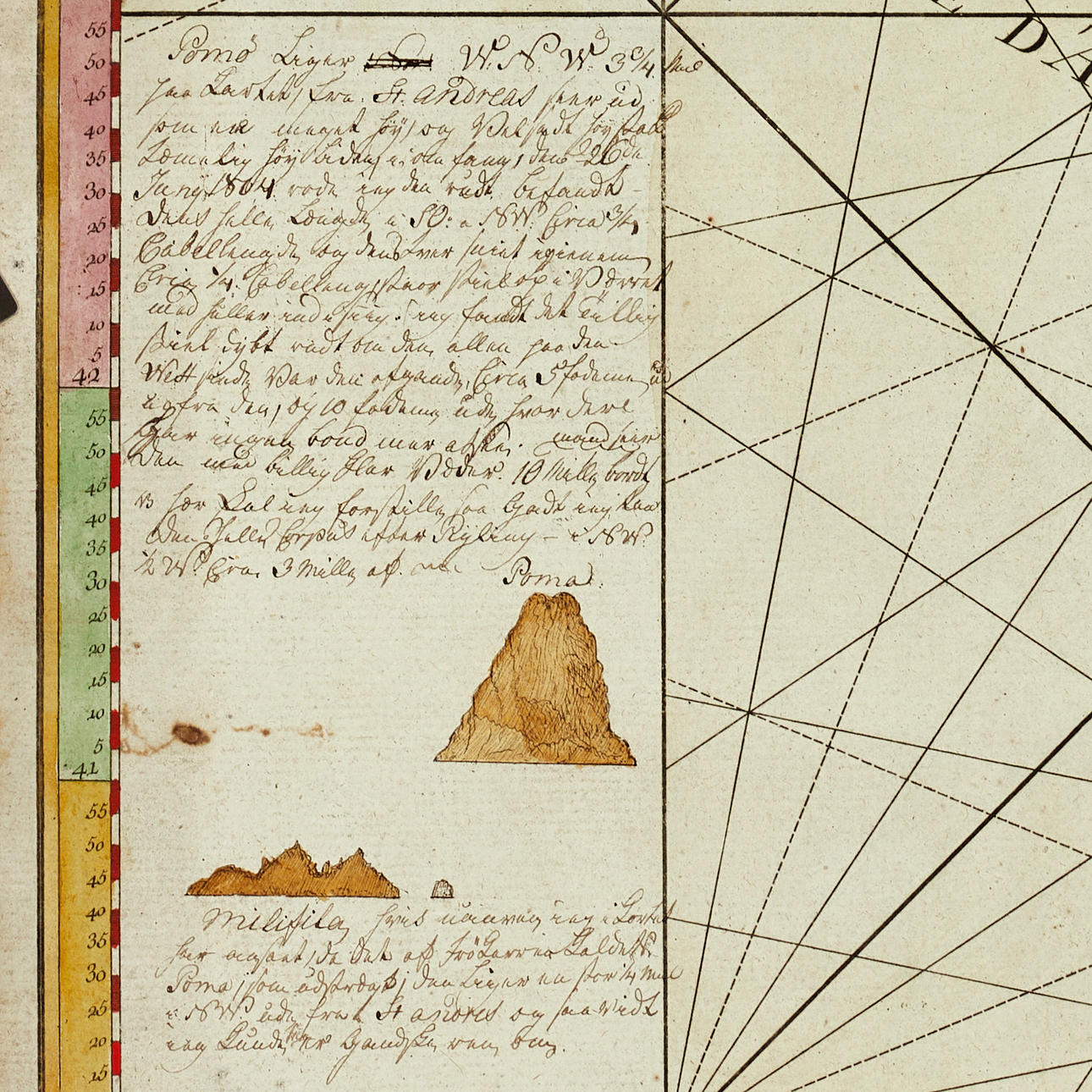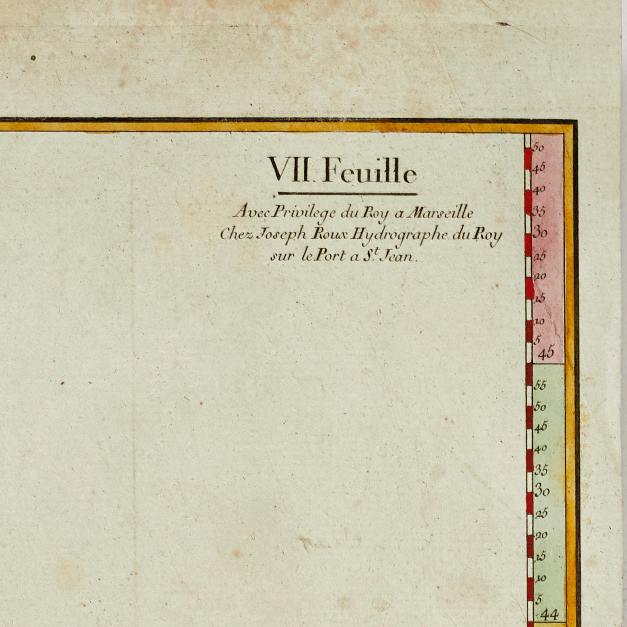 Joseph Roux (1725-1793), "VII.e Feuille", ur "Carte de la Mer Mediterranée en Douze Feuilles", graverat och handkolorerat sjökort över Venedigbukten, 1764. I vänstra delen en teckning och svårtydda handskrivna kommentarer där årtalet 1804 nämns.