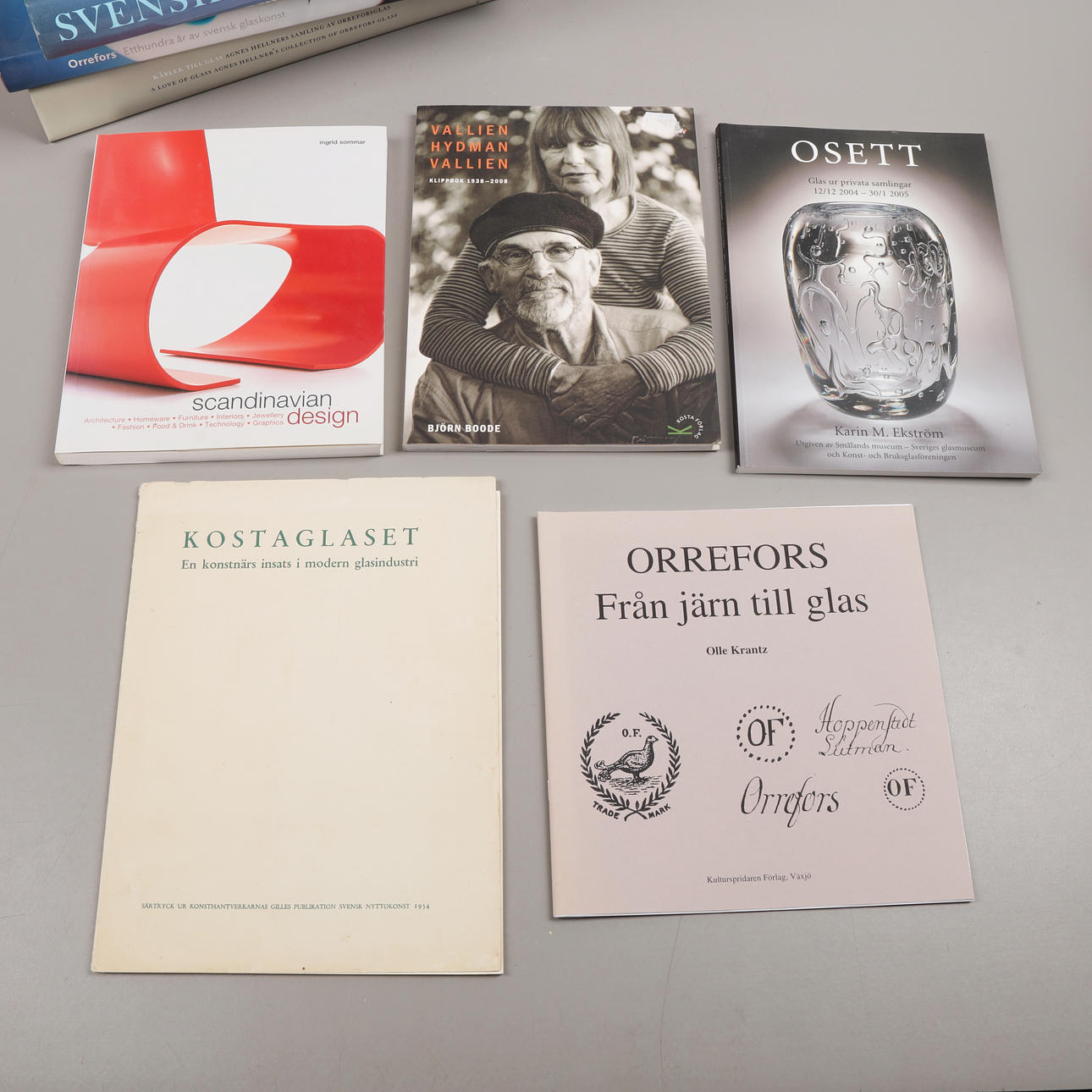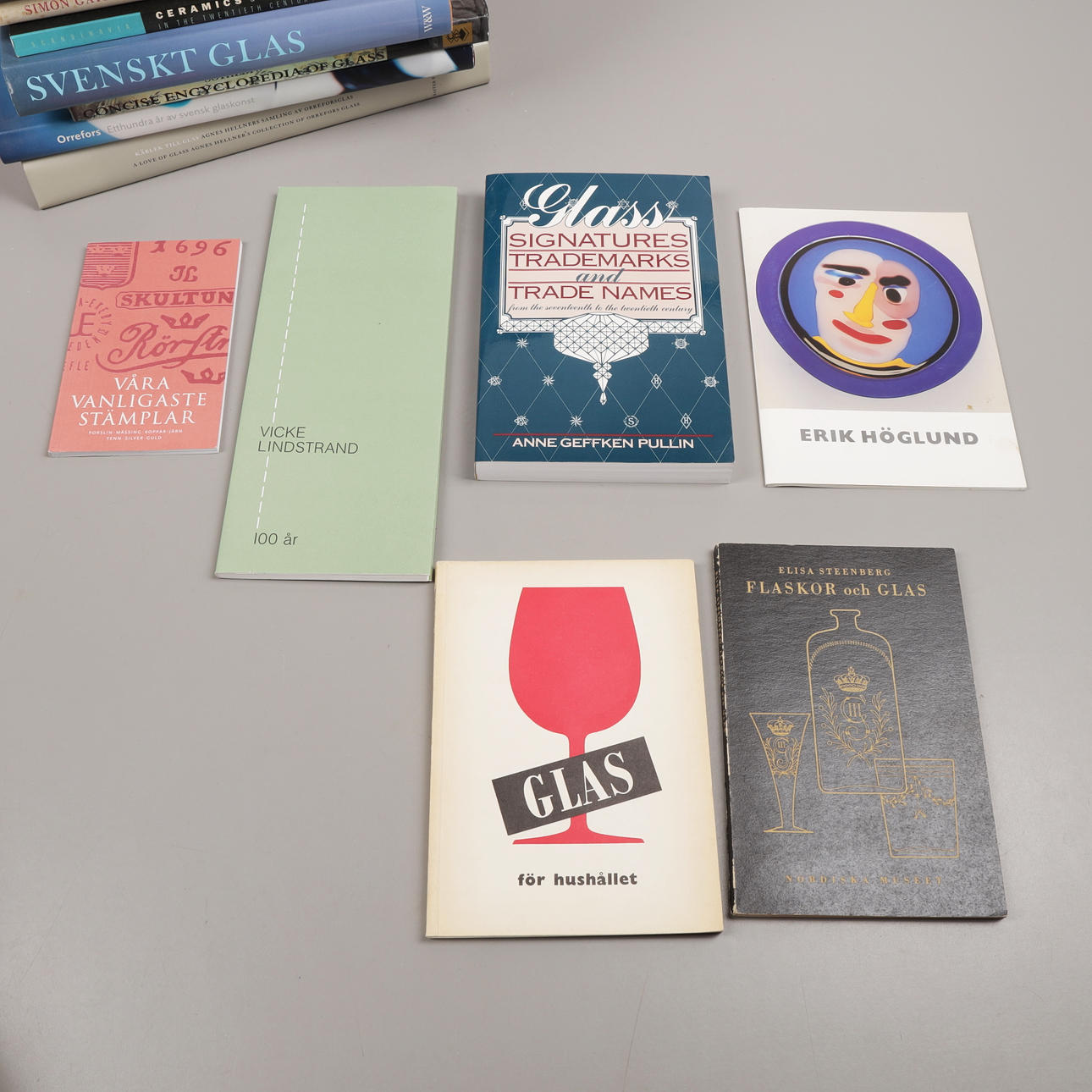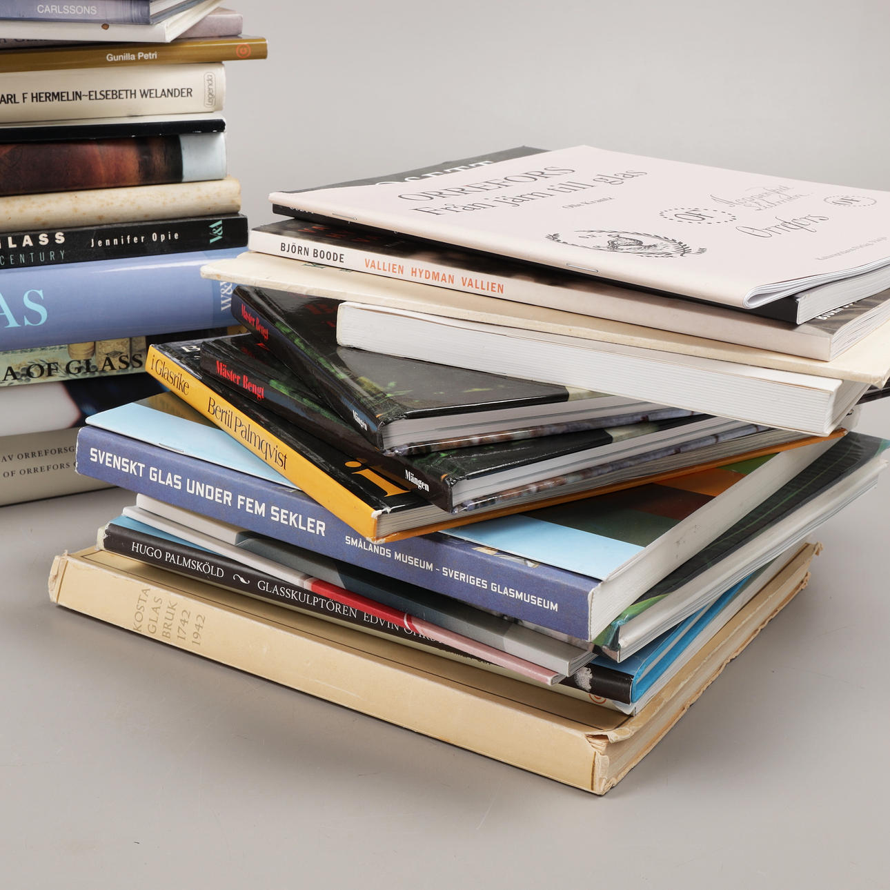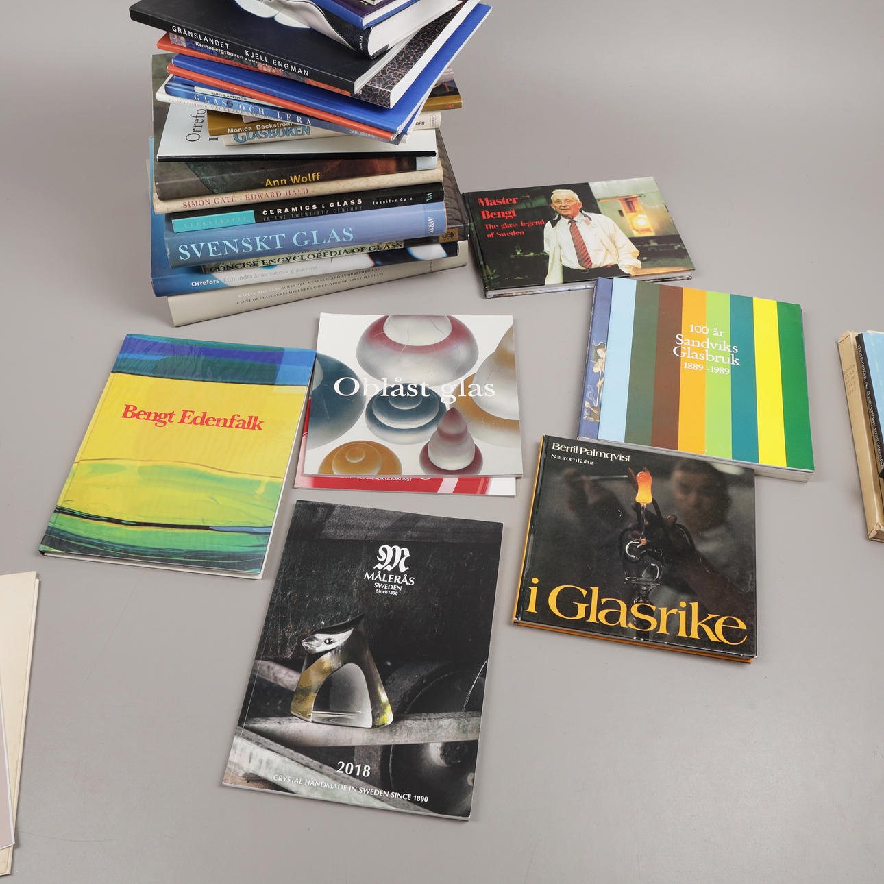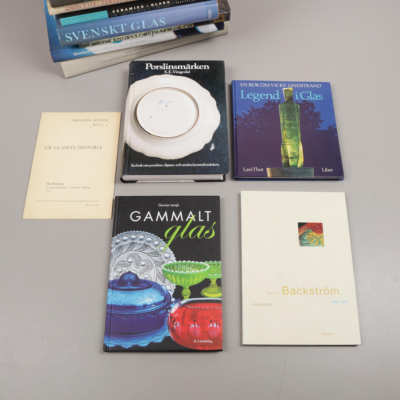 49 st böcker om Orrefors, Kosta, Sandviks glasbruk, Hovmantorp, Målerås och glasformgivare som Monica Backström, Kjell Engman, Bengt Edenfalk, Erik Höglund, Vicke Lindstrand, Göran Wärff, Lars Hellsten, Edvin Öhrström, Simon Gate, Ann Wolff mfl.