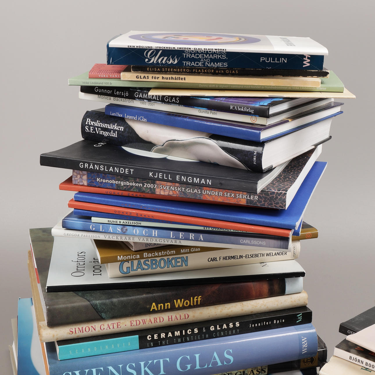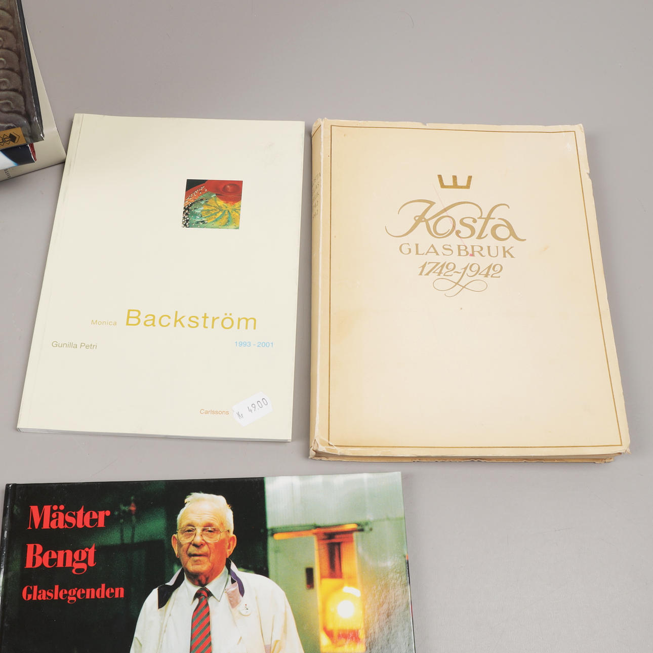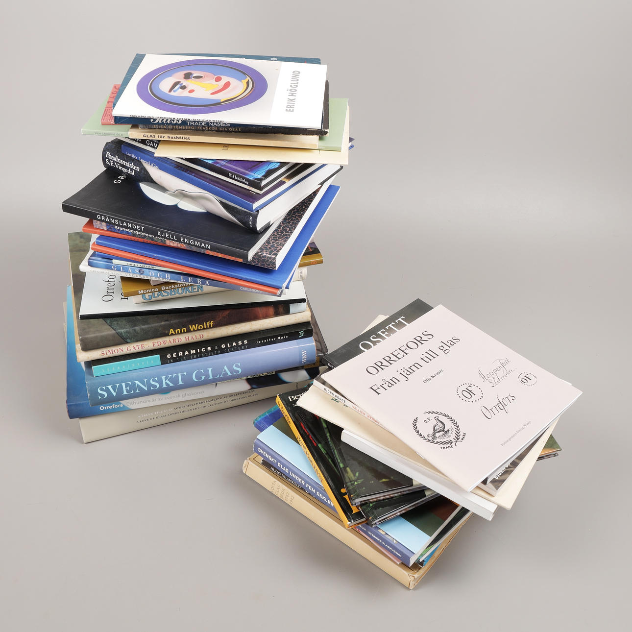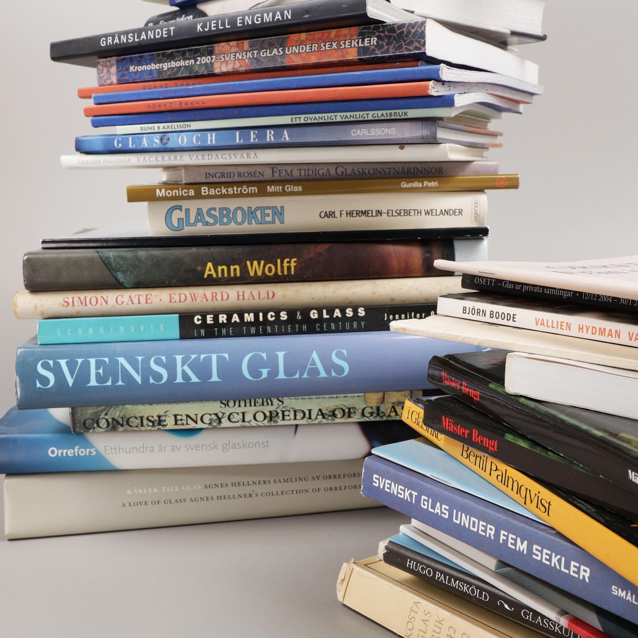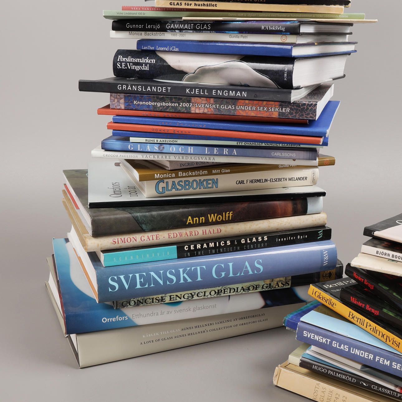 49 st böcker om Orrefors, Kosta, Sandviks glasbruk, Hovmantorp, Målerås och glasformgivare som Monica Backström, Kjell Engman, Bengt Edenfalk, Erik Höglund, Vicke Lindstrand, Göran Wärff, Lars Hellsten, Edvin Öhrström, Simon Gate, Ann Wolff mfl.