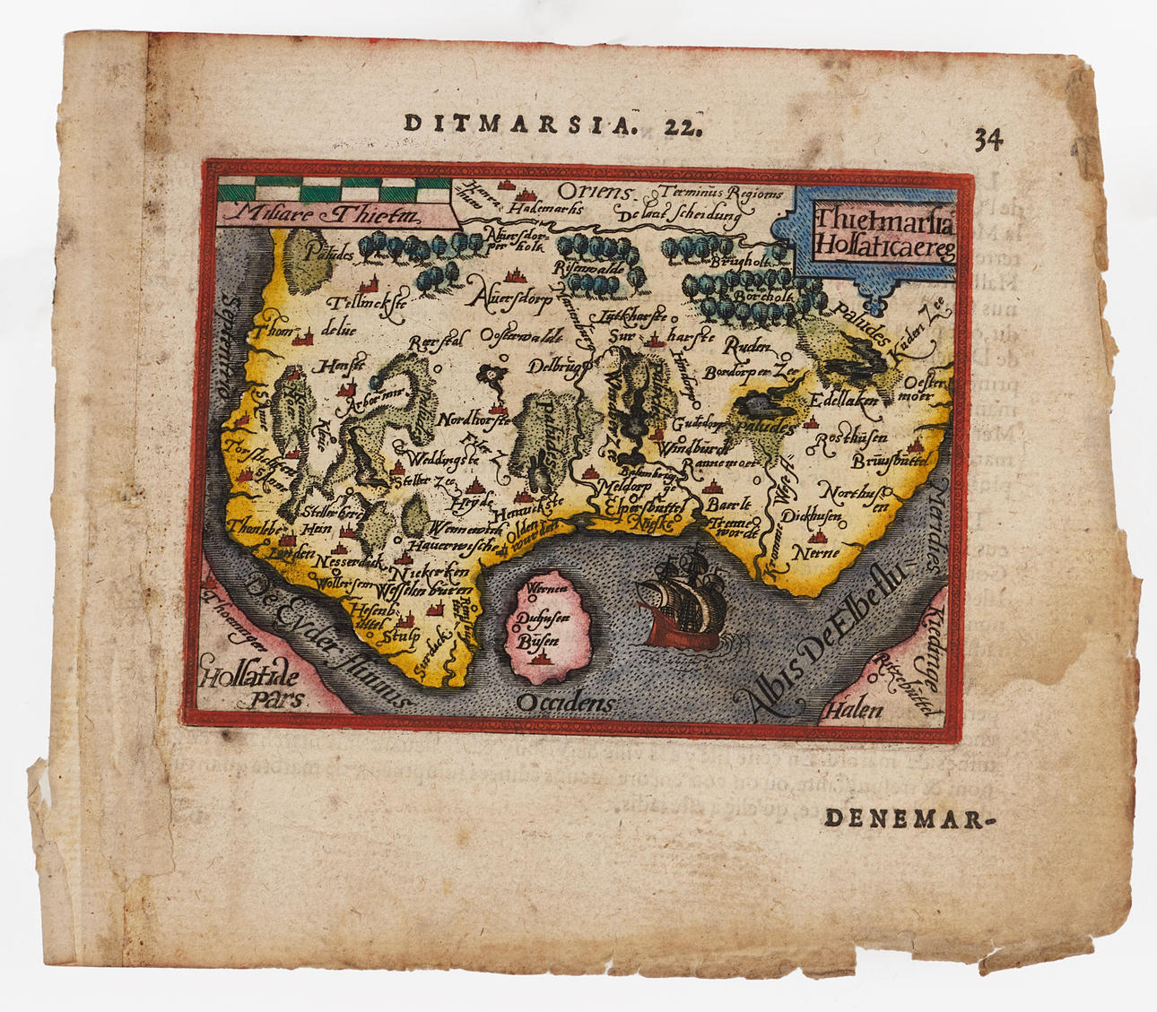 Oidentifierad, graverad och handkolorerad karta "Thietmarsia. Holsaticaereg" troligen efter J. Hondius/P. Bertius "Atlas Minor", 1600-tal.