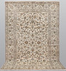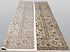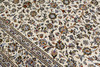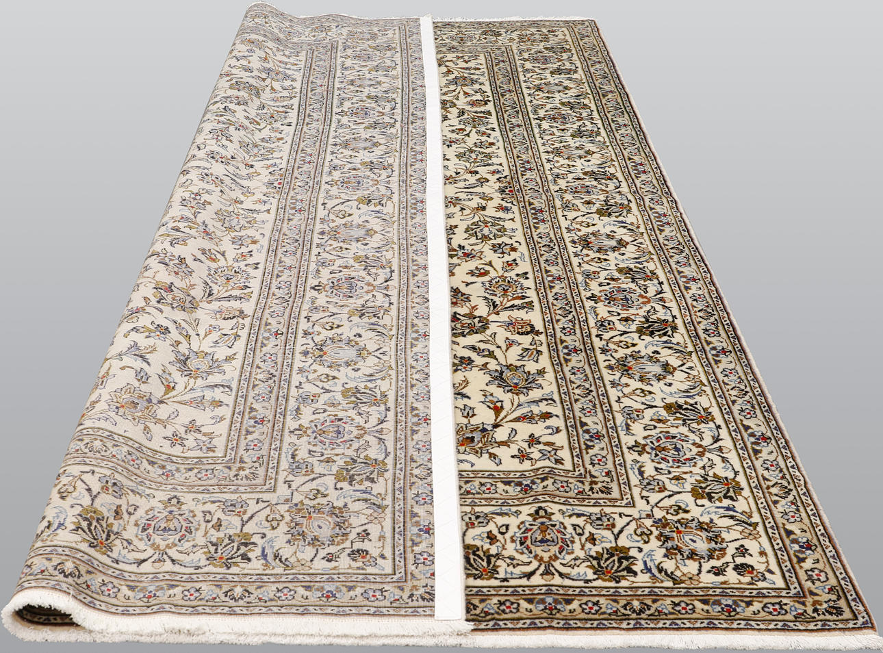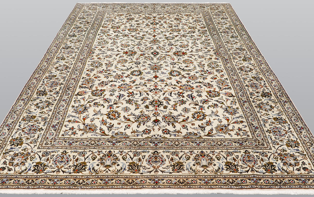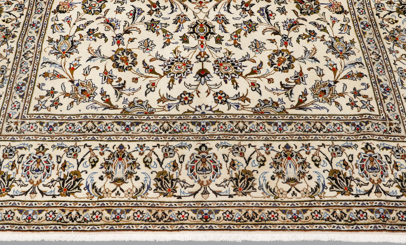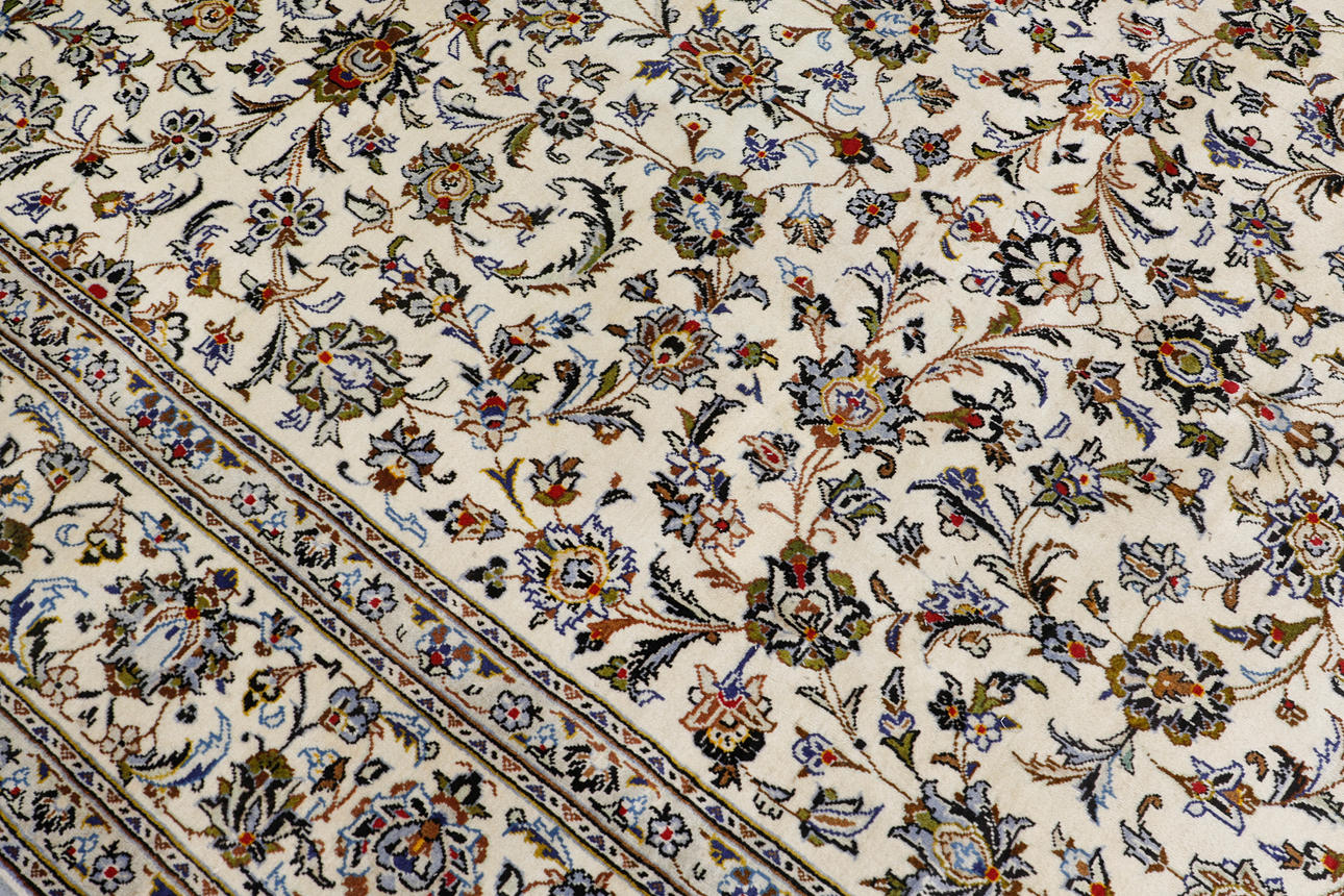 Keshan med ljus bottenfärg och ett mittfält täckt med floralornamentik, palmetter och arabesker i blått, beige och röda detaljer. Bården har en ljus botten och dekor av palmettrankor. Luggen är av ull och varpen är av bomull.