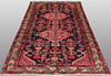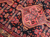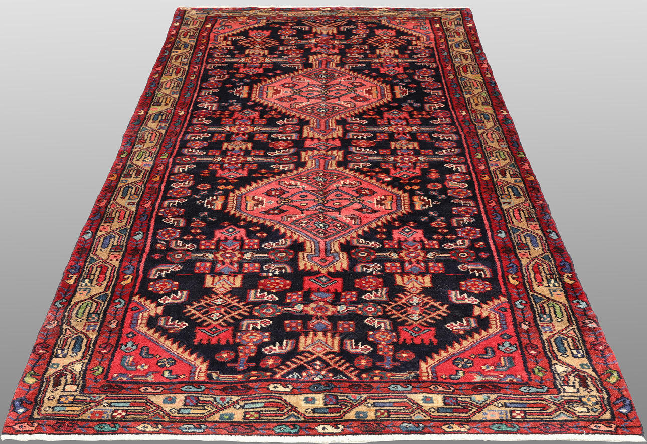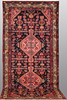 Hamadan i gallerimodell med mörk bottenfärg och ett geometriskt mönster med centrala medaljonger i rött, rosa, blått och beige. Bården har gul botten och dekor av geometriska ornament. Luggen är av ull och varpen av bomull.