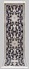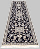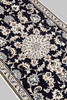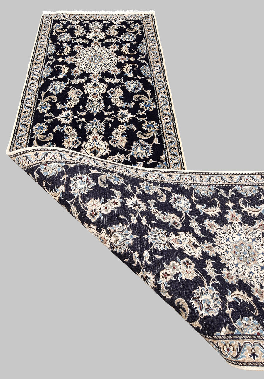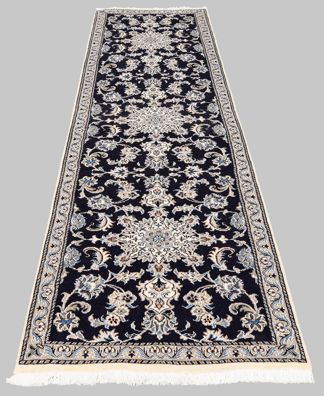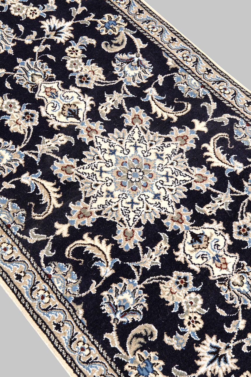 Nain gallerimodell med mörkblå bottenfärg och ett mittfält med dekor av medaljonger, floral ornamentik, palmetter och arabesker i blå och beigea toner. Bården har beige botten och floral dekor i matchande färgskala. Luggen är av ull med inslag av silke och varpen är av bomull.