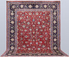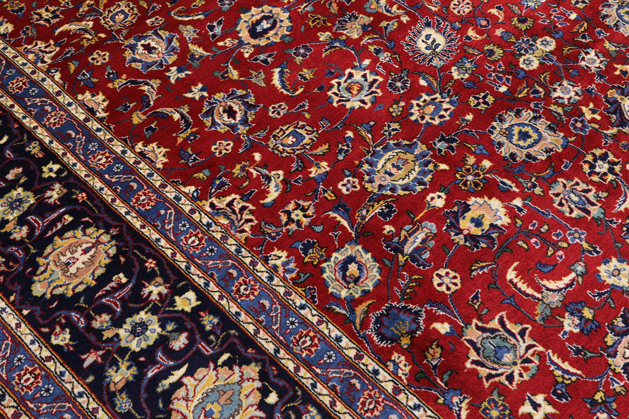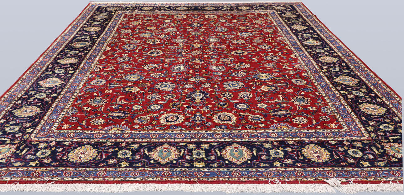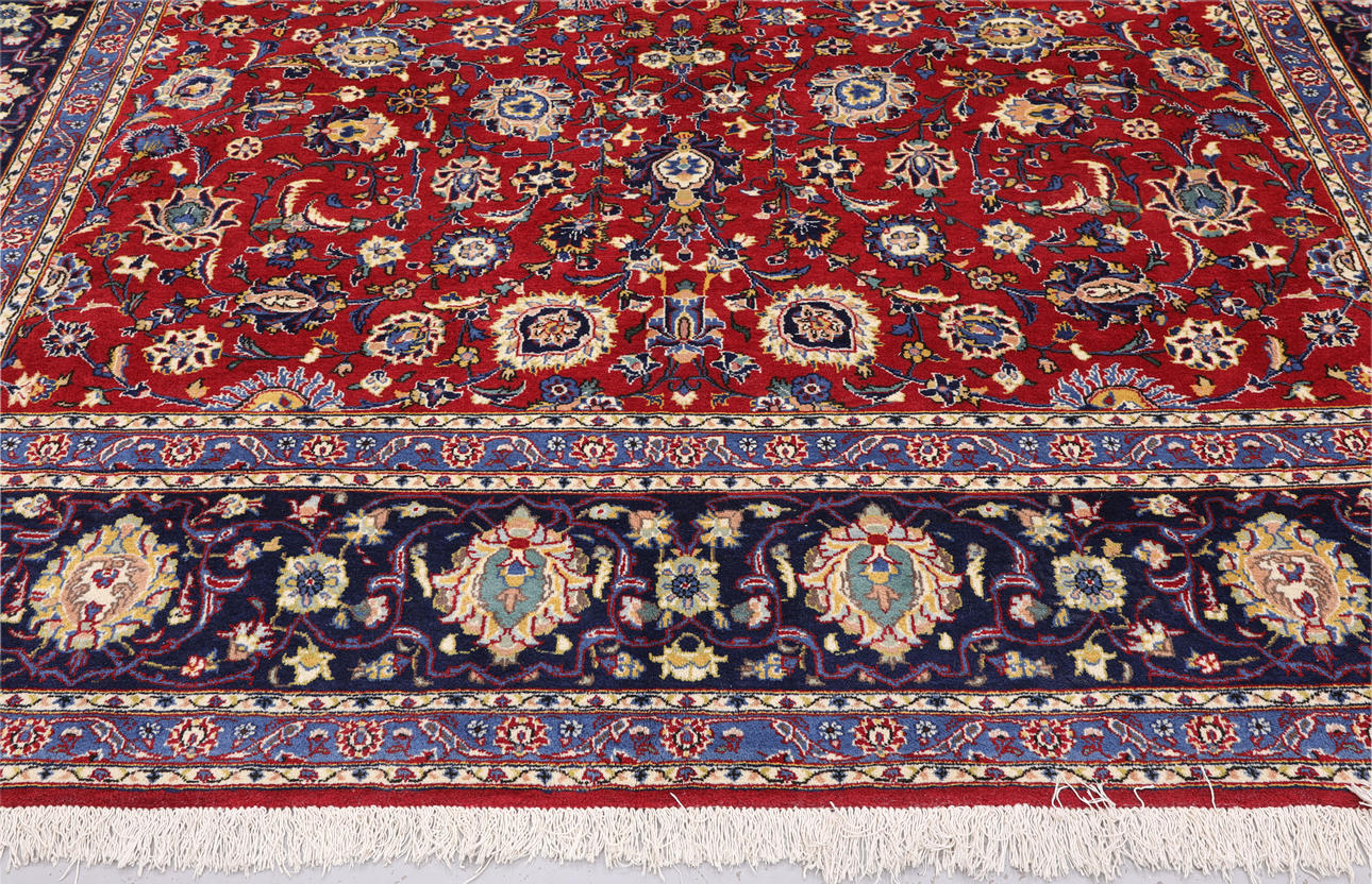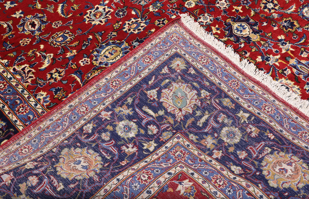 Keshan fine med röd bottenfärg och ett mittfält täckt av floralornamentik, palmetter och arabesker i blått, beige och grönt. Bården har en mörk botten och dekor av palmettrankor. Luggen är av ull och varpen är av bomull.