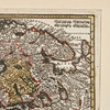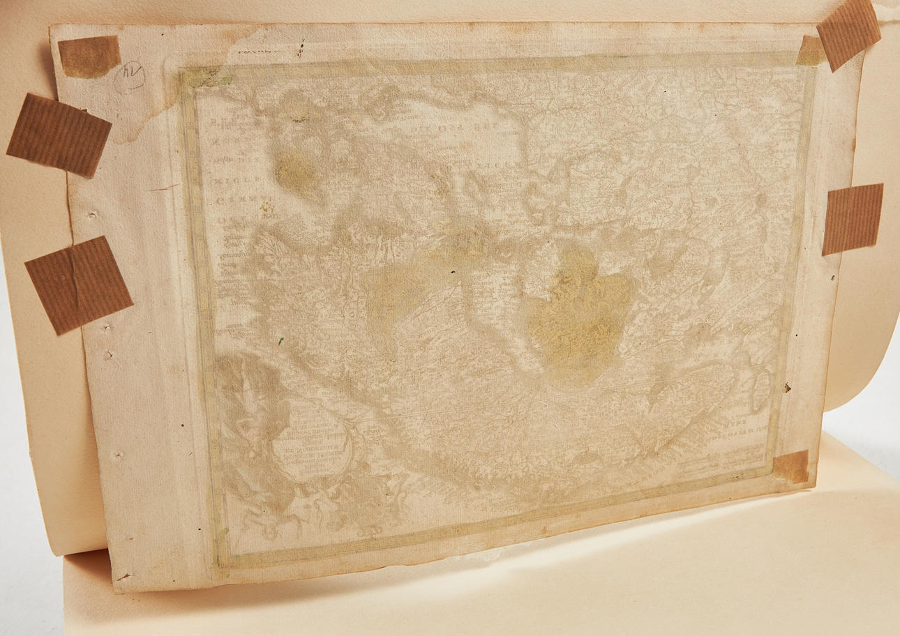 Handkolorerad graverad karta med figurative kartusch, 2 figurer och Sveriges vapen, ca 200x260 mm. Graverad av T. C. Lotter.