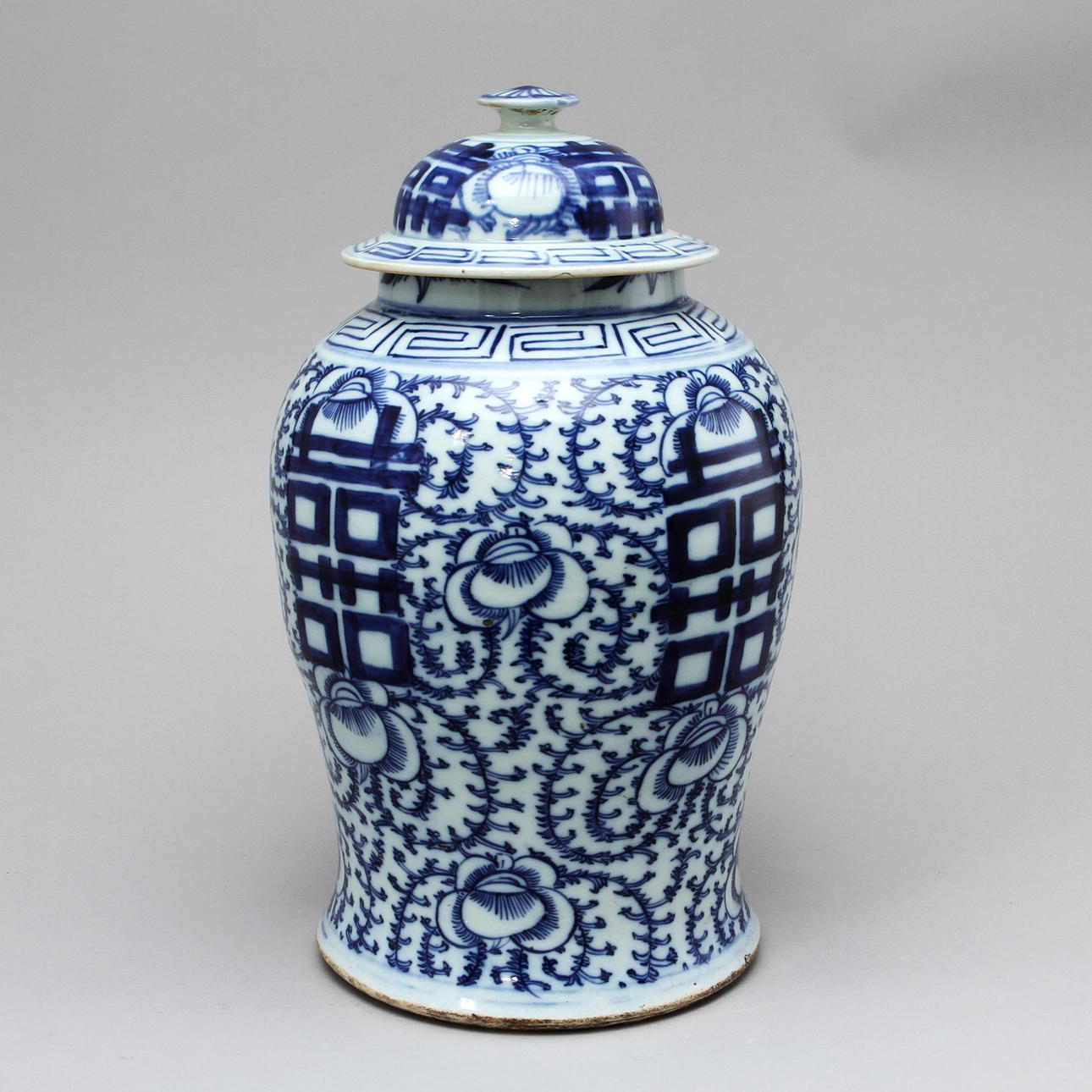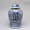Dekor i underglasyrblått av växter och lyckotecken. Höjd 43 cm.