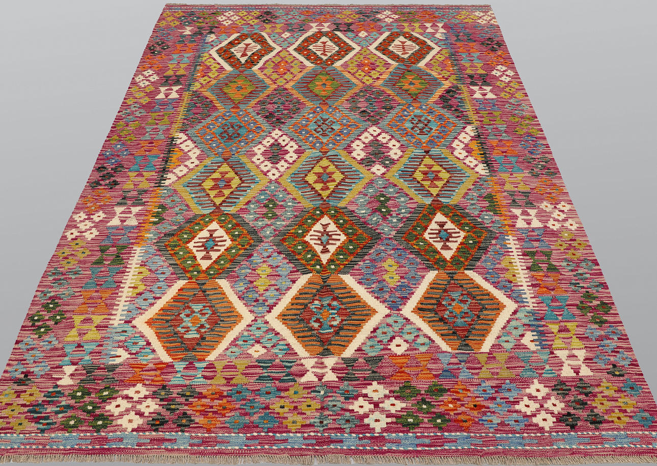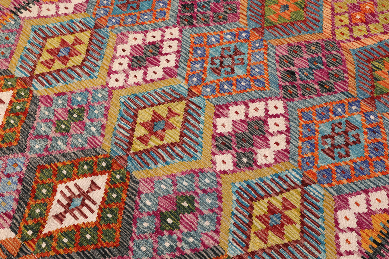 Handvävd Kelim i klassisk design med geometriskt mönster i polykrom färgskala.