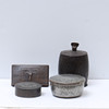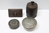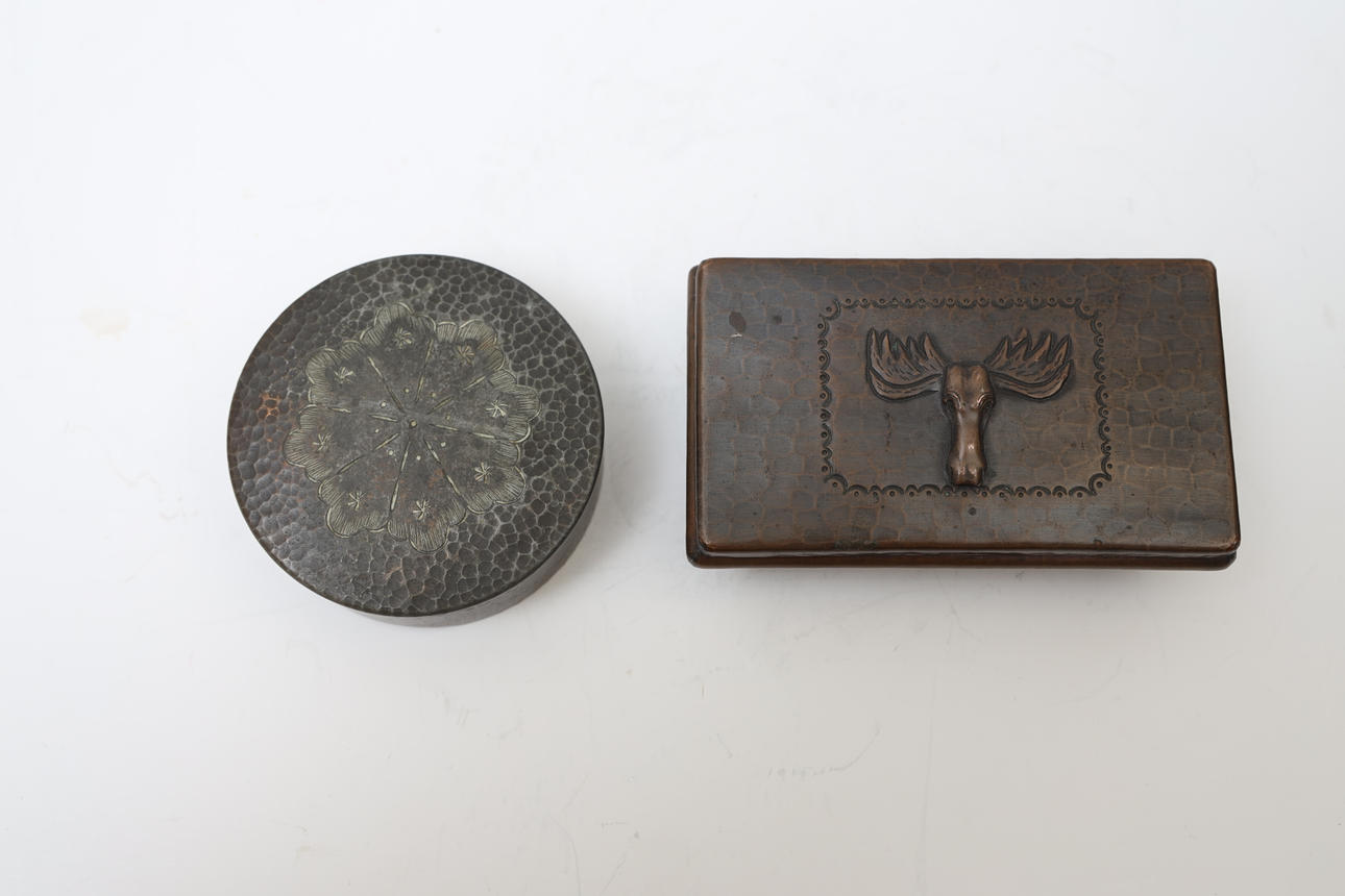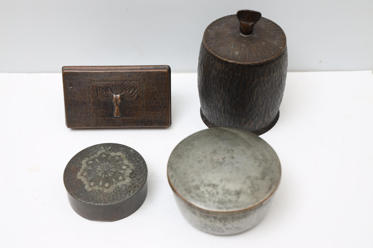 Tobaksburks i brons, samt 3 dosor i koppar. Delvis med reliefdekor och kulhamrad dekor.