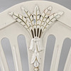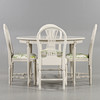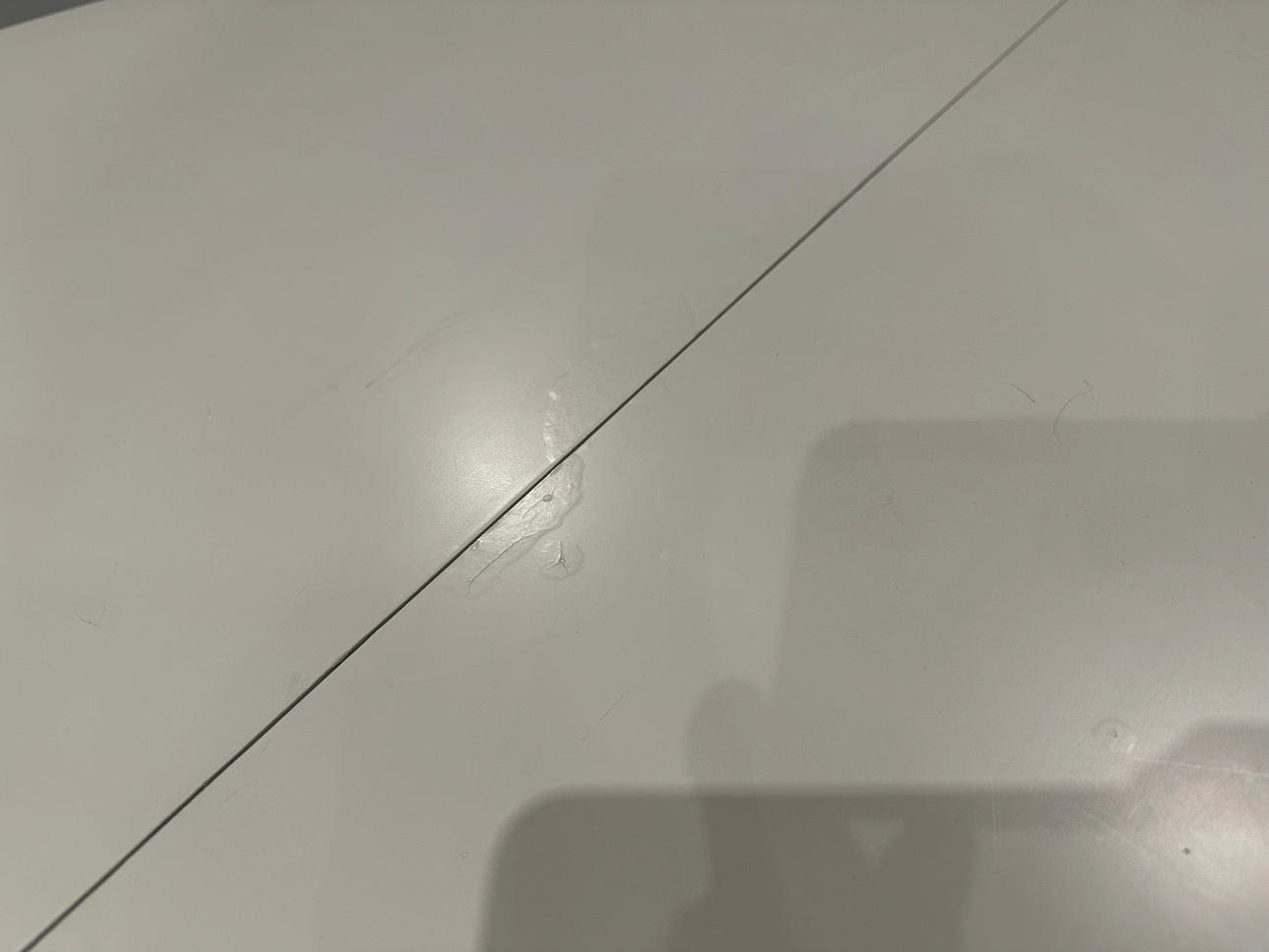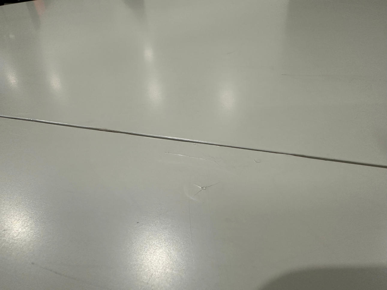 Nyansskillnad mellan bord och stolar, skivan med märken och upphöjningar, skavmärken, fläckar på tyget.