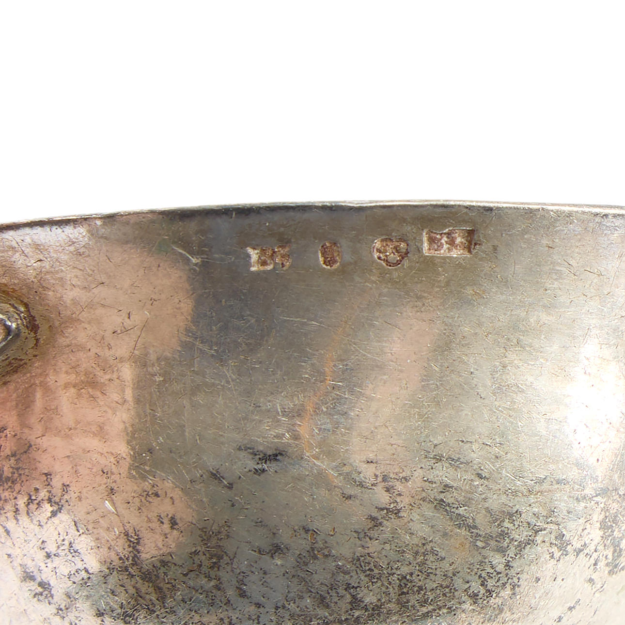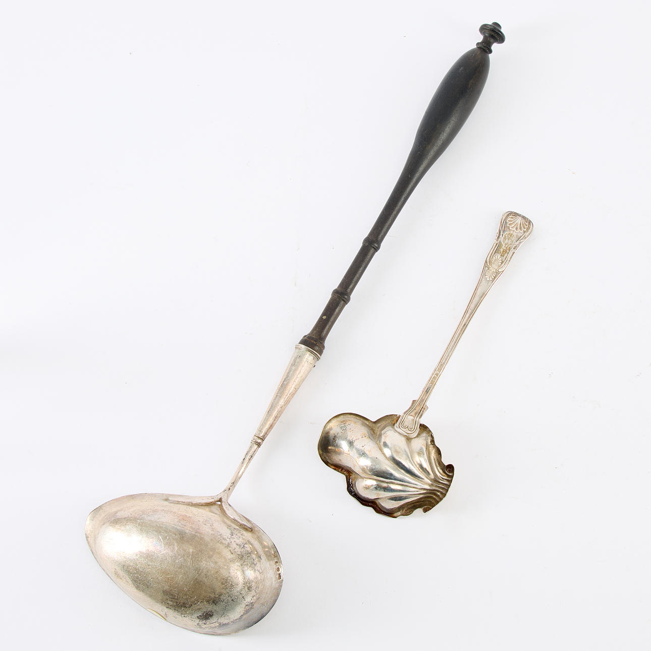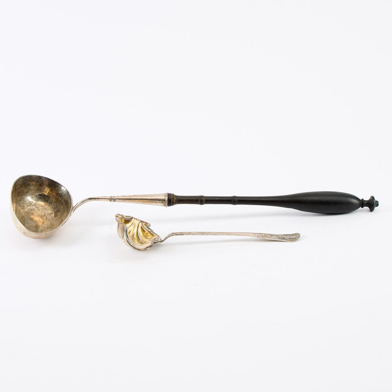 4880948. SOPPSLEV OCH SÅSSLEV, soppsleven med slitna oidentifierade svenska stämplar, 1800-tal. Såssleven stämplad av Anna Catharina Berg, Hudiksvall 1859, engelsk snäck med ägarmärkning.