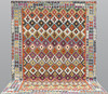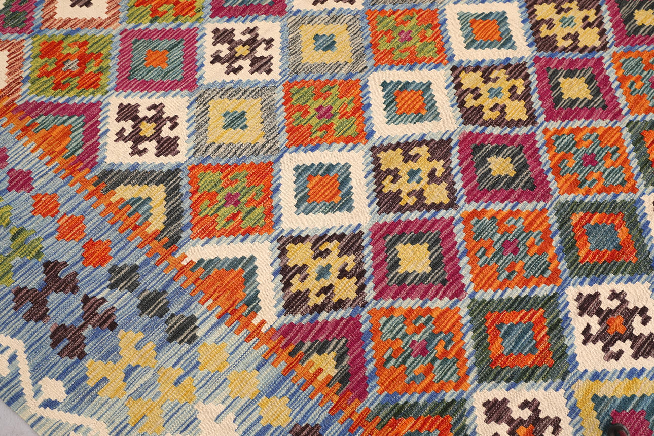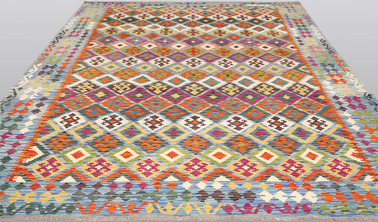 Handvävd Kelim i klassisk design med geometriskt mönster i polykrom färgskala.