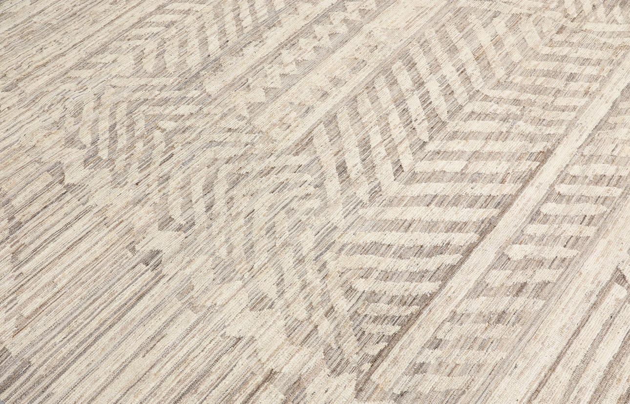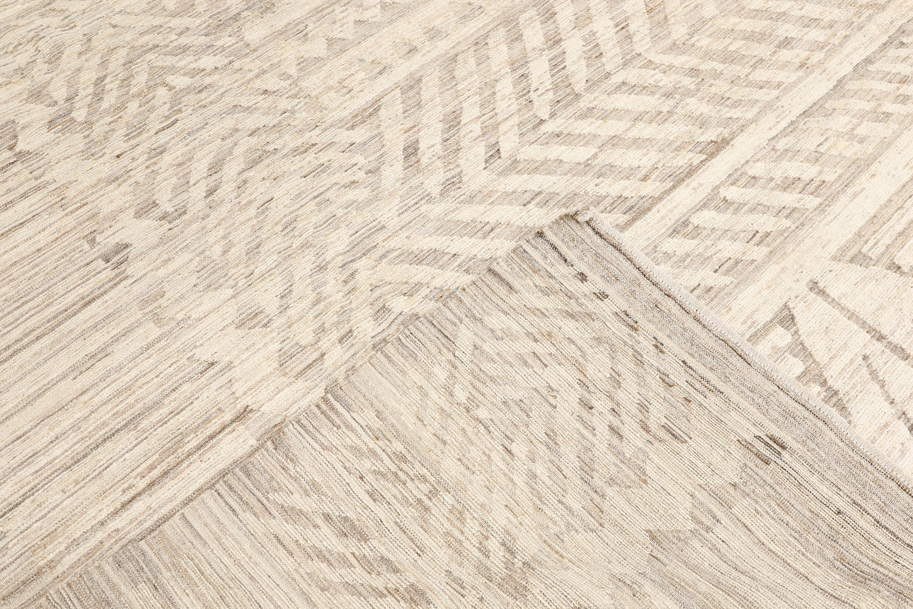 Marocko design med ljus, naturfärgad botten i beige och sandtoner. Mattan har ett diskret ton-i-ton-mönster som består av geometriska former och sicksacklinjer. Luggen är av ull och varpen är av bomull.