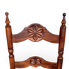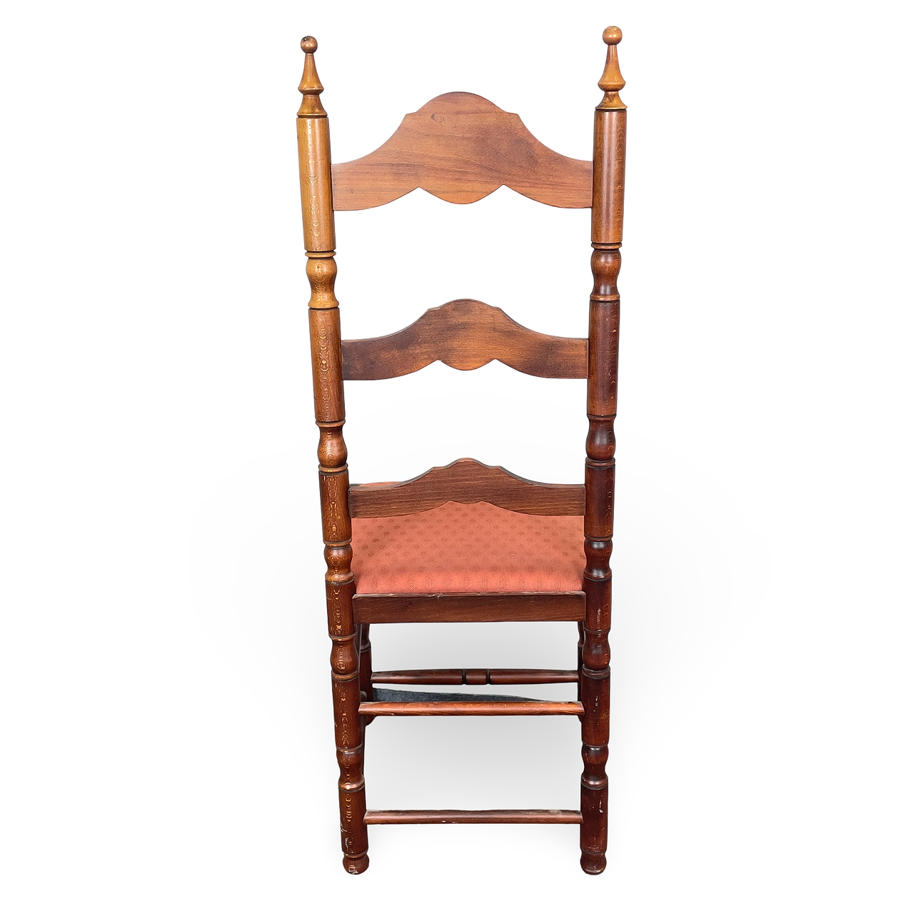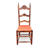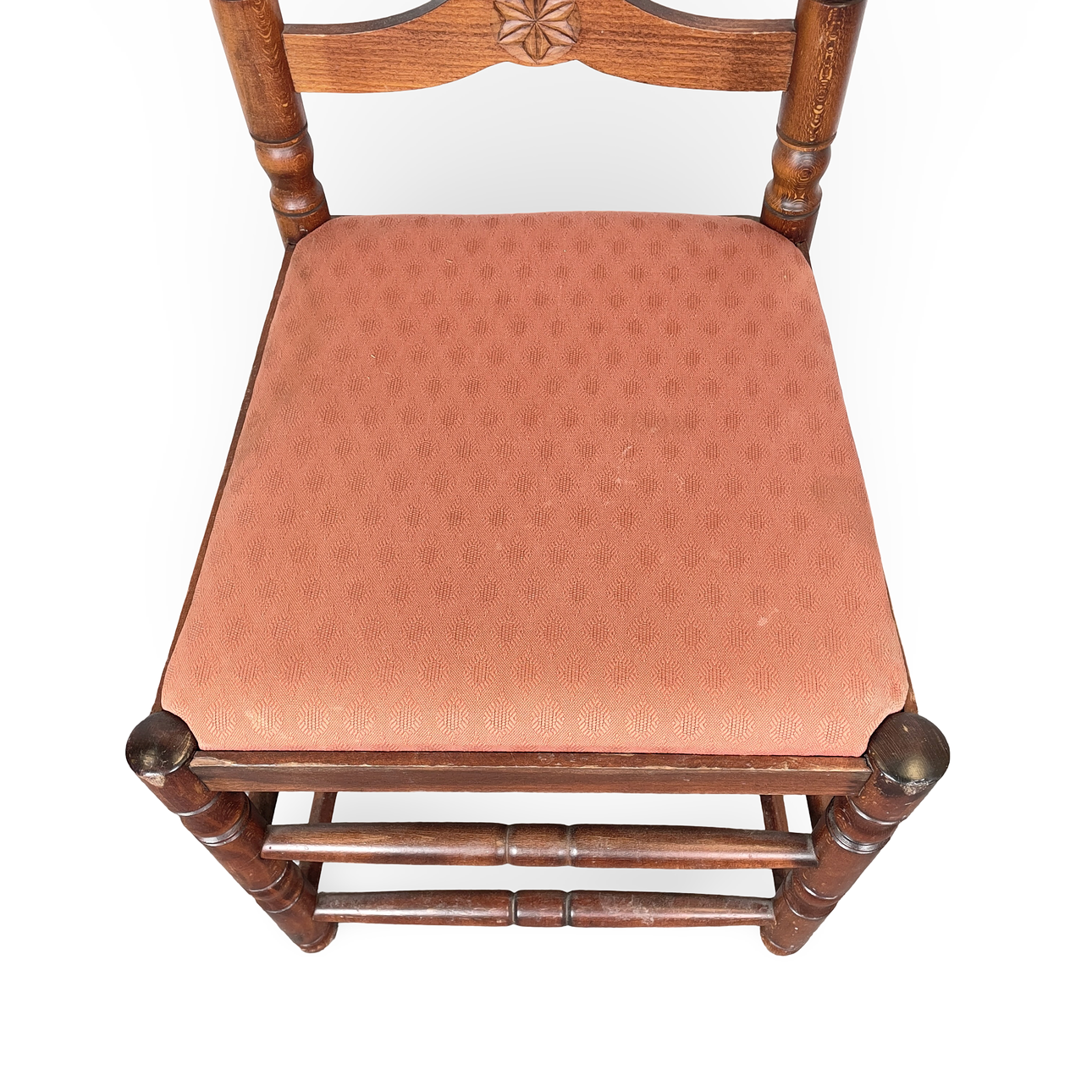 Stol i lackerat trä med stegrygg, svarvade detaljer och skuren dekor. Lös stoppad sits klädd mönstrad textil.