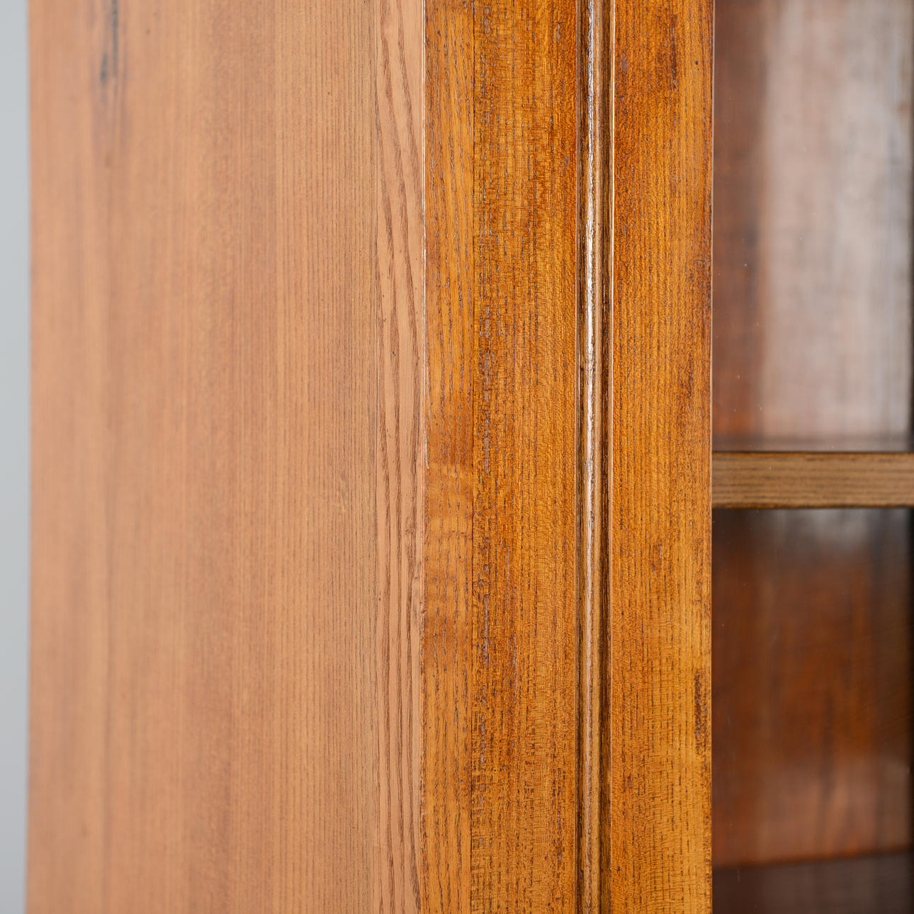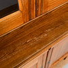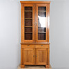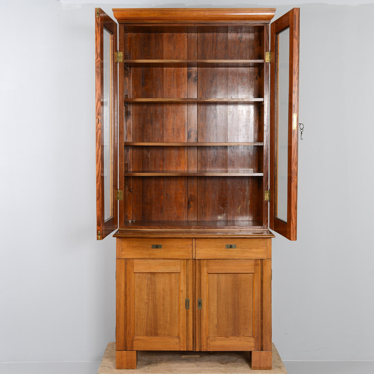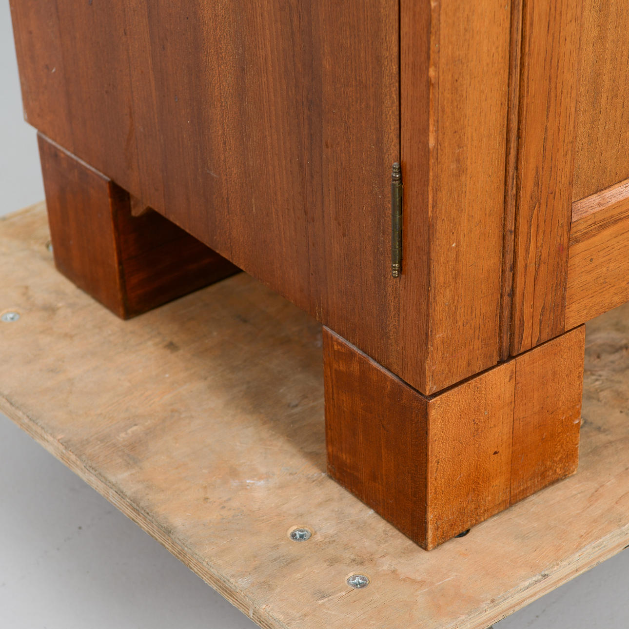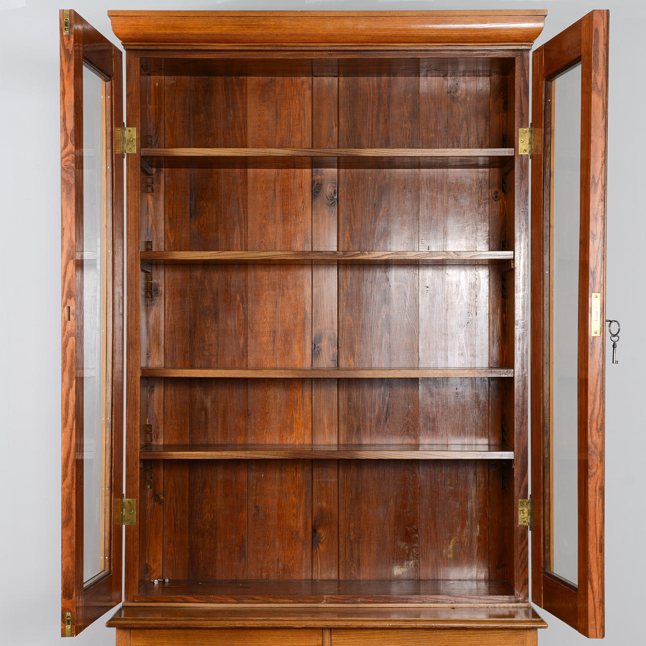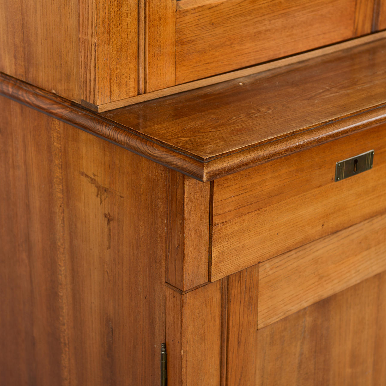 Tvådelat skåp. Övre del med vitrindörrar med handblåst glas och bakomliggande hyllplan, underdel med pardörrar och utdragbara lådor. Övre sockel avtagbar för frakt.