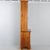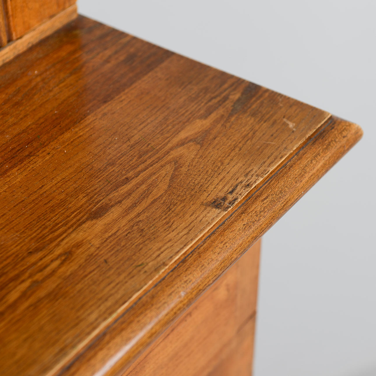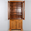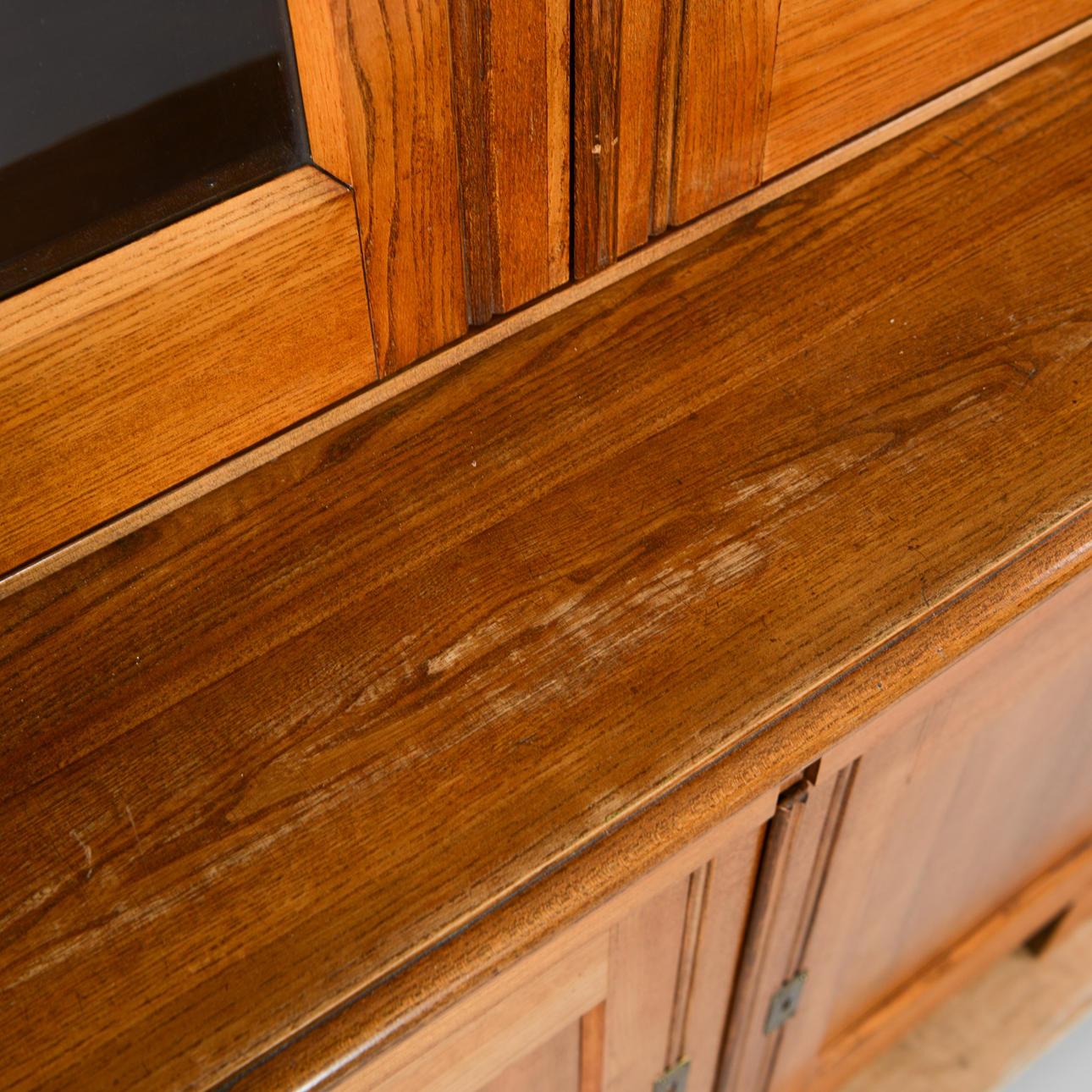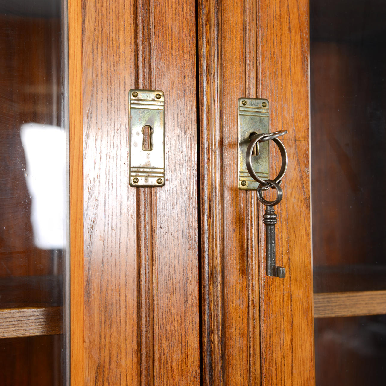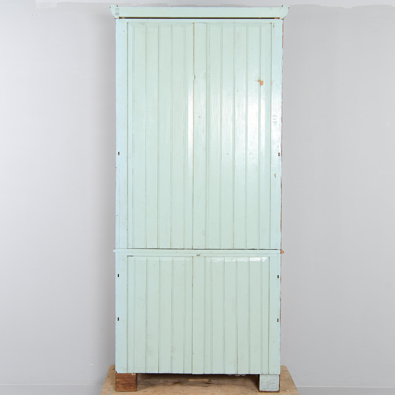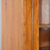 Tvådelat skåp. Övre del med vitrindörrar med handblåst glas och bakomliggande hyllplan, underdel med pardörrar och utdragbara lådor. Övre sockel avtagbar för frakt.