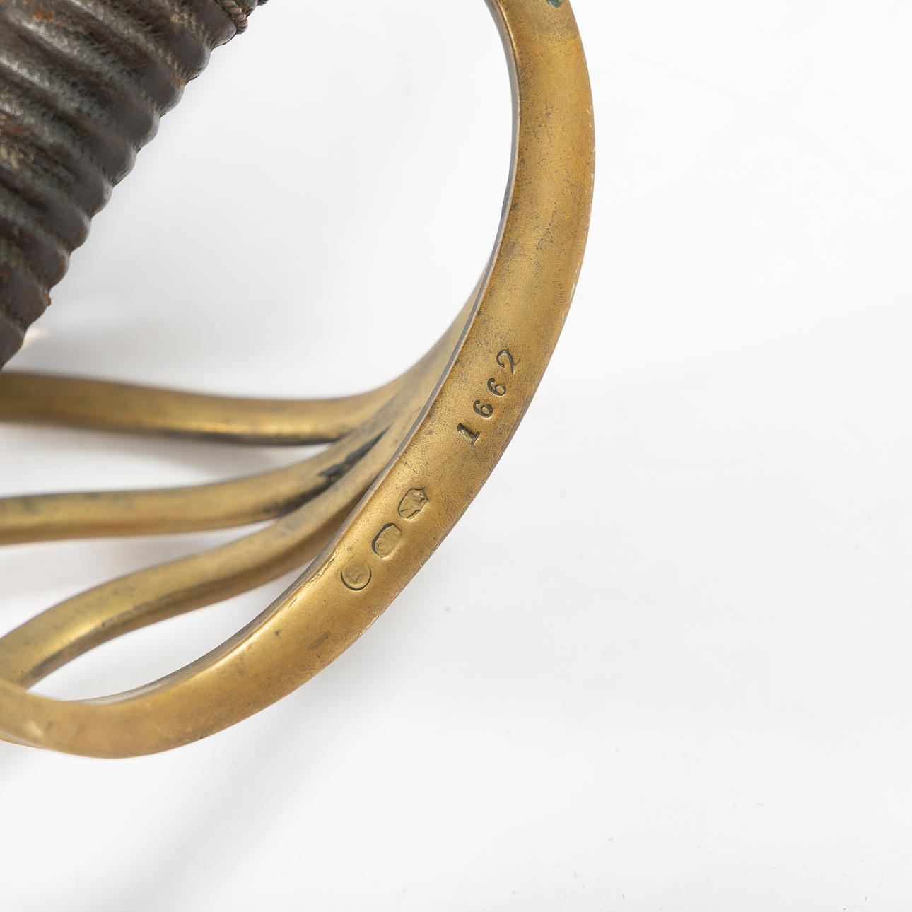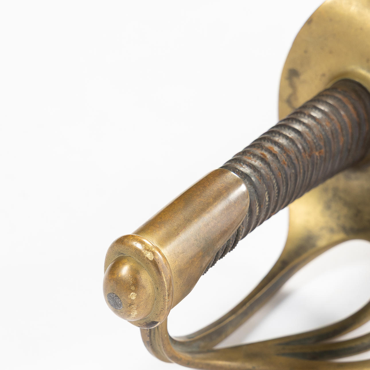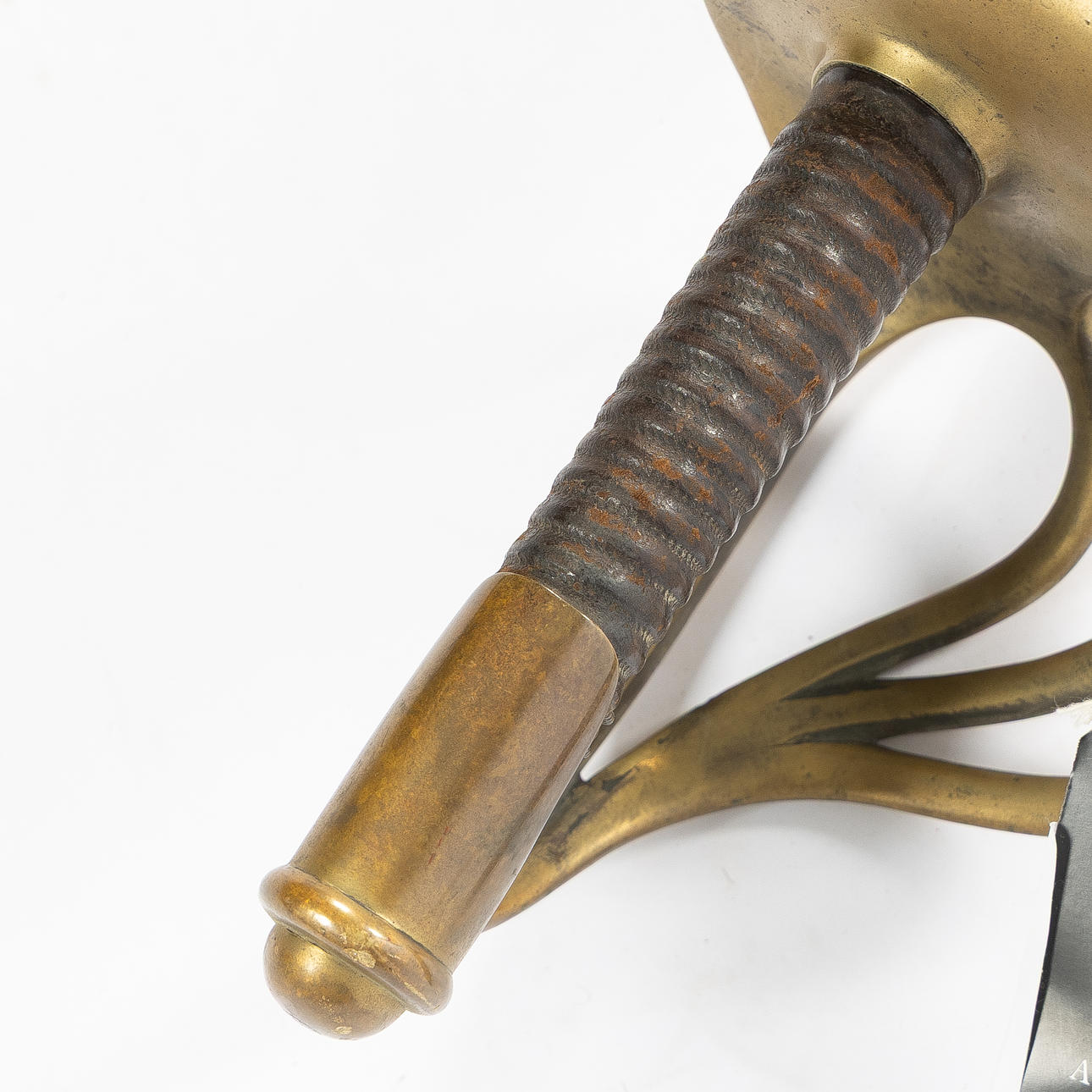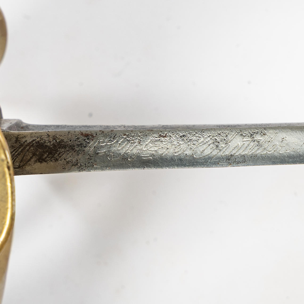 Mässingfäste, läderklädd kavel med rester av tvinnad mässingstråd. Klingans rygg med gravyr.Längd totalt. ca 110 cm.