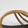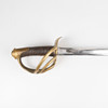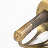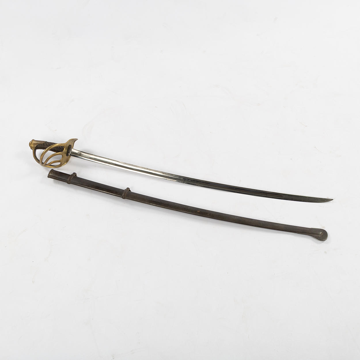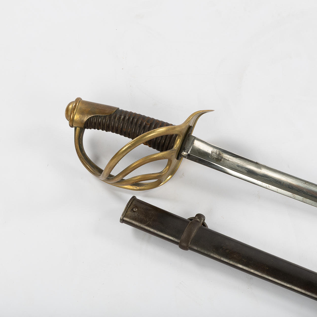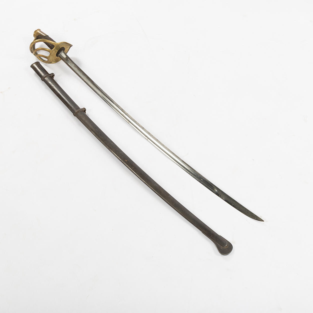 Mässingfäste, läderklädd kavel med rester av tvinnad mässingstråd. Klingans rygg med gravyr.Längd totalt. ca 110 cm.