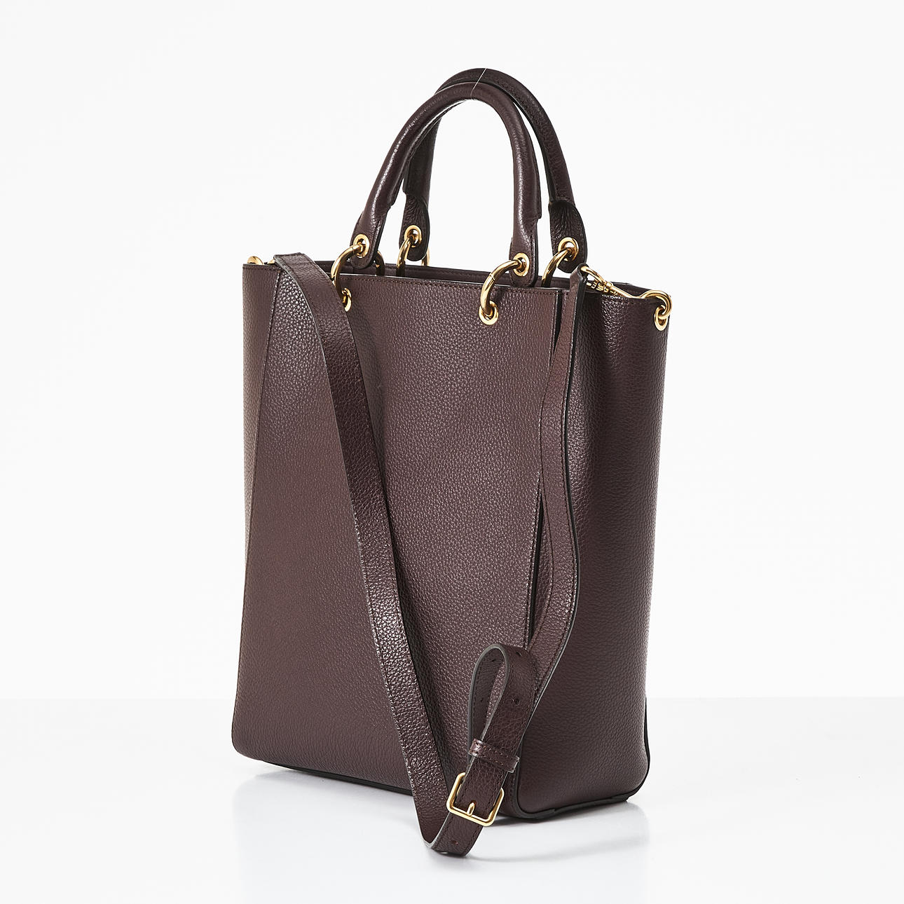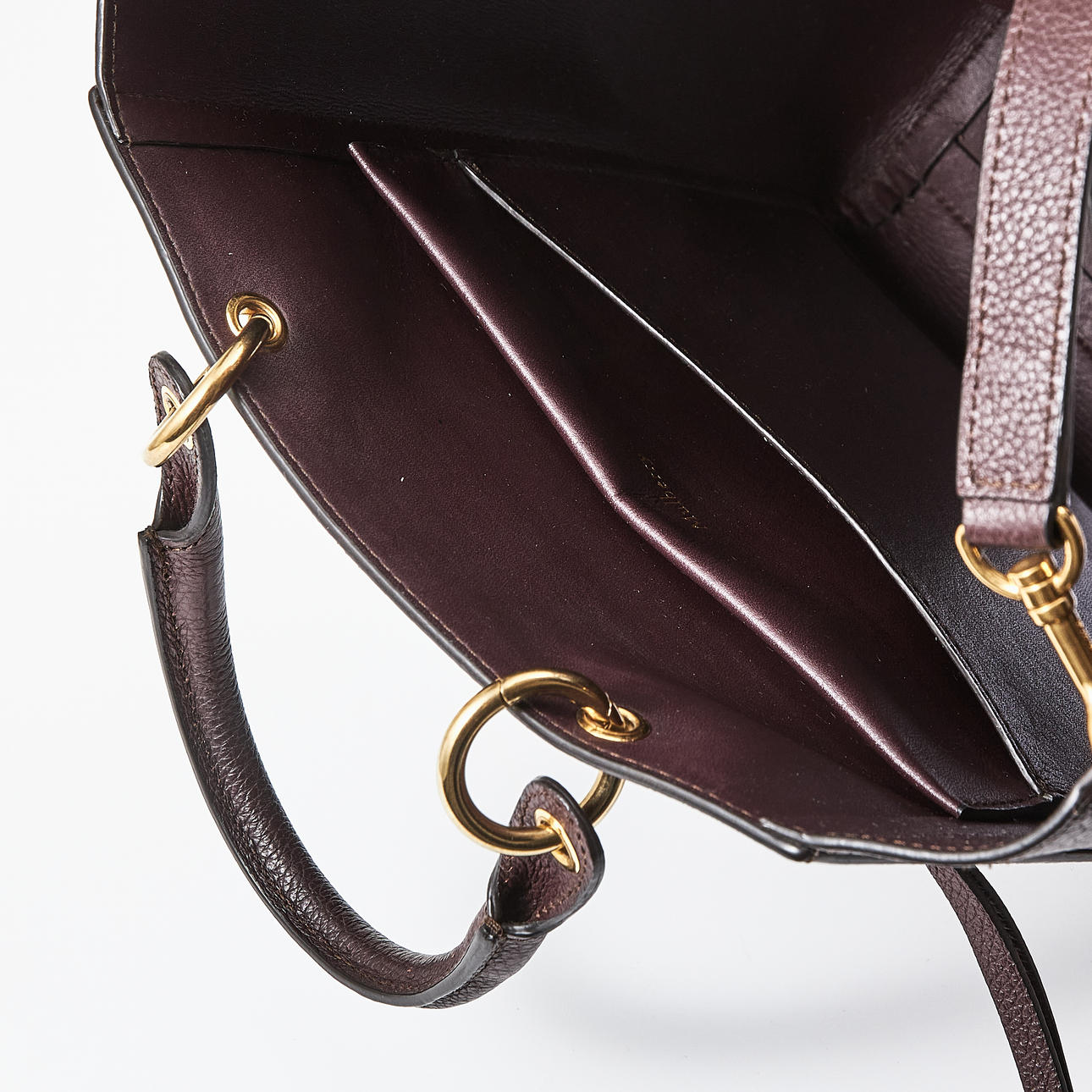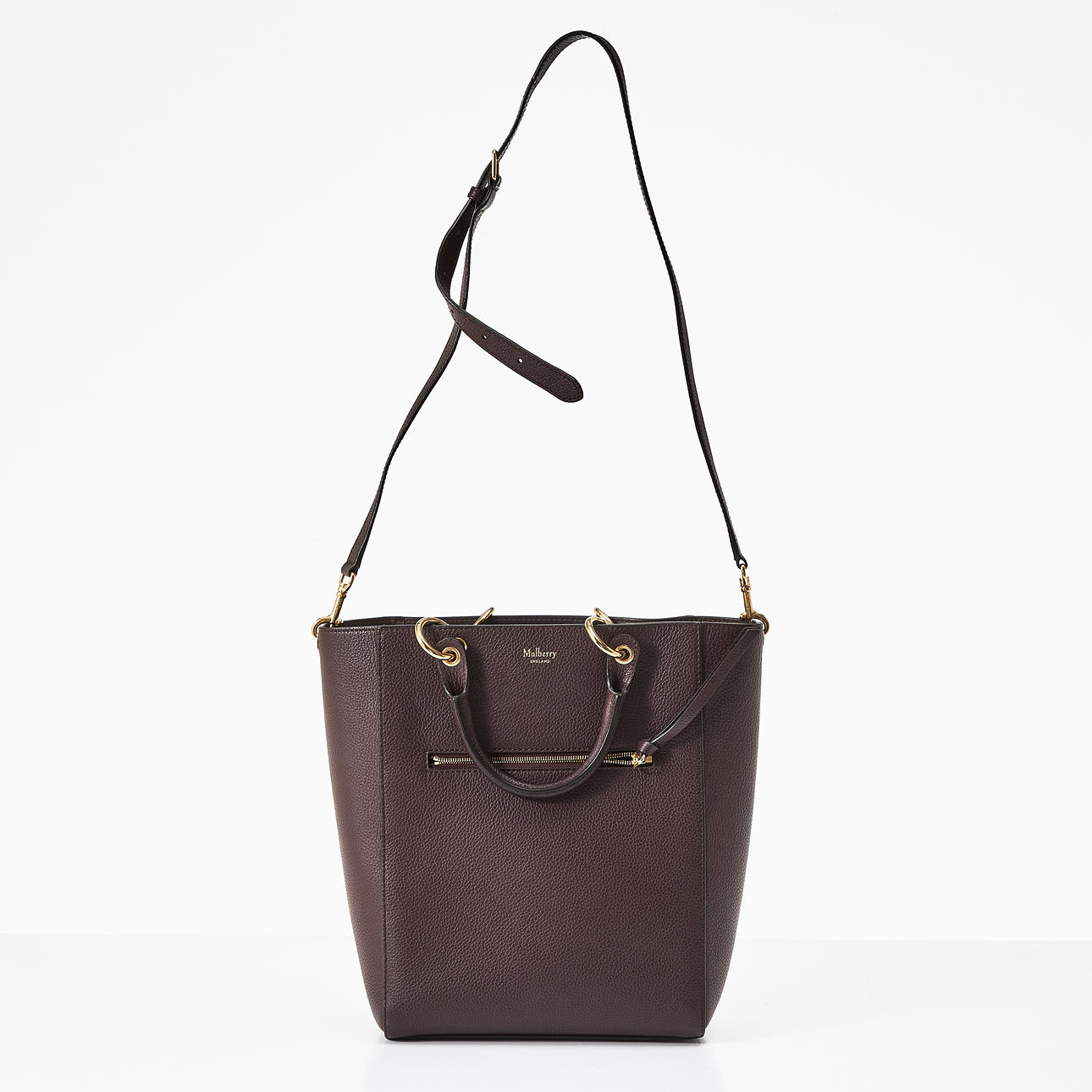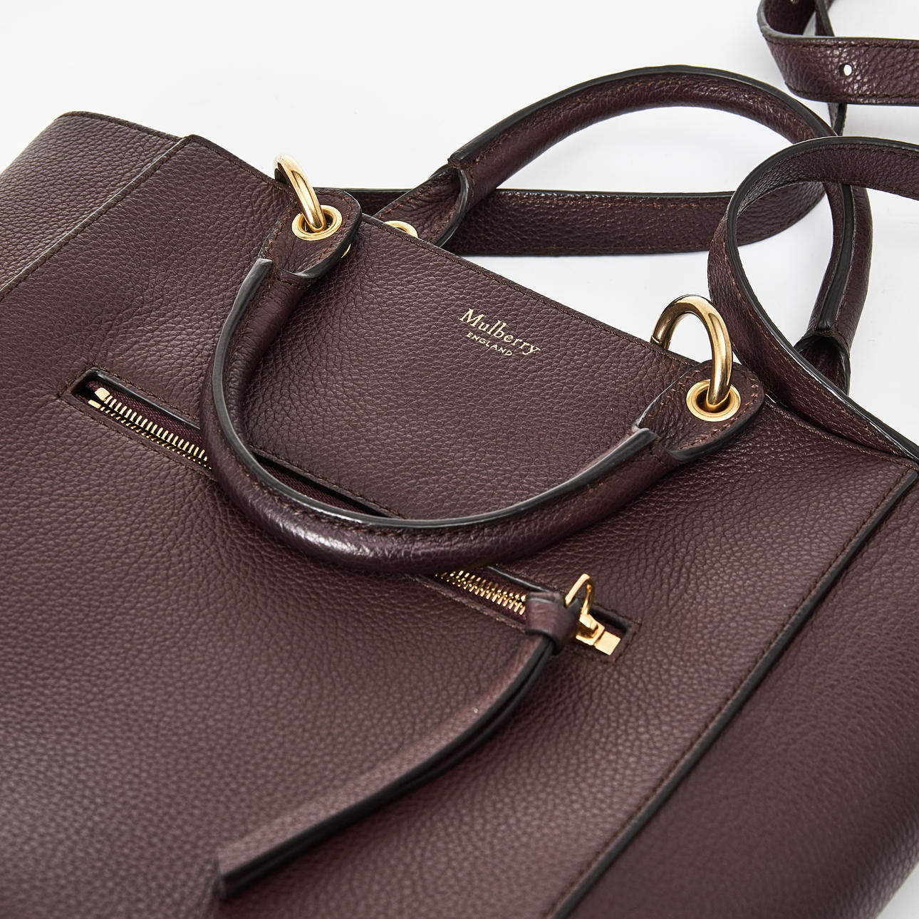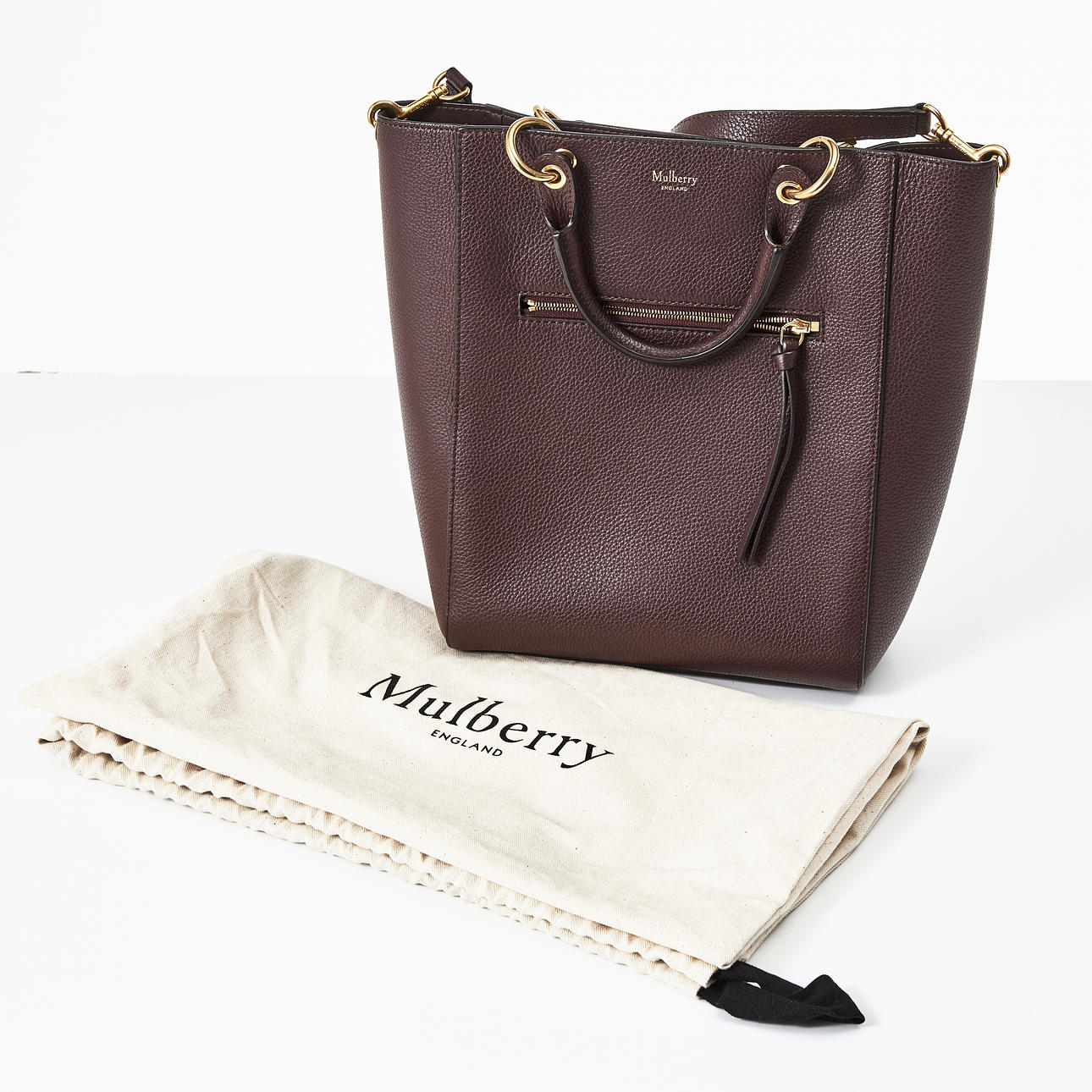Totemodell, präglat skinn, avtagbar och justerbar axelrem, detaljer i gulmetall, ficka framtill, fodrad i matchande skinn, märkt "Mulberry England", mått ca 22 x 29 x 11 cm