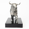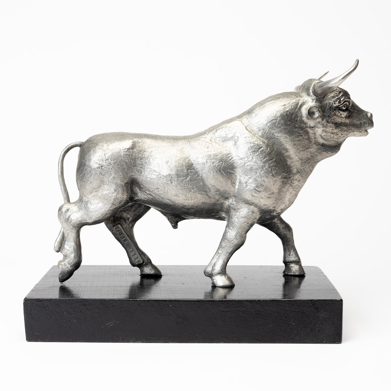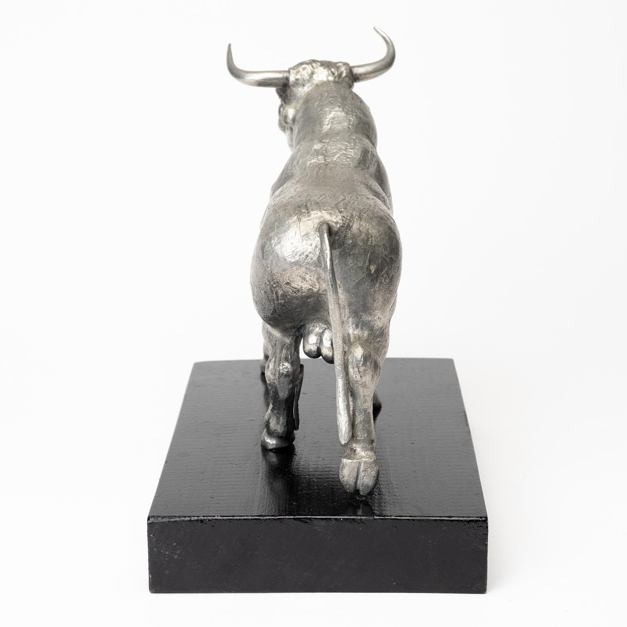 Tjurens längd ca 23, sockelns mått ca 22x12,5. Höjd ca 19 cm inklusive sockel.