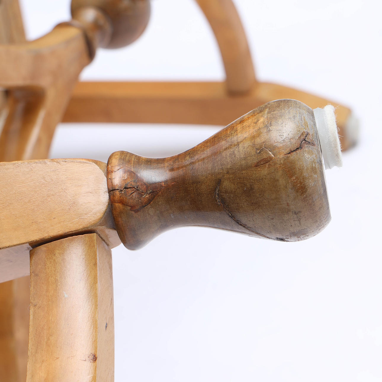 Senare omklädda fåtöljer. Bruks- och åldersrelaterat slitage. Fjädrar upplevs ojämnt spända i de båda fåtöljerna. Lagning på ena foten, se bild.