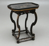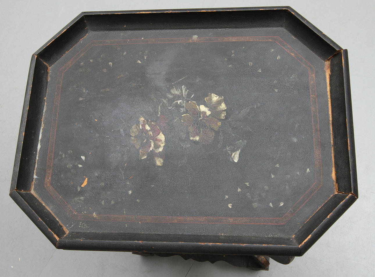 Svart, målad dekor av blommor. Längd 50, bredd 39, höjd 64 cm.