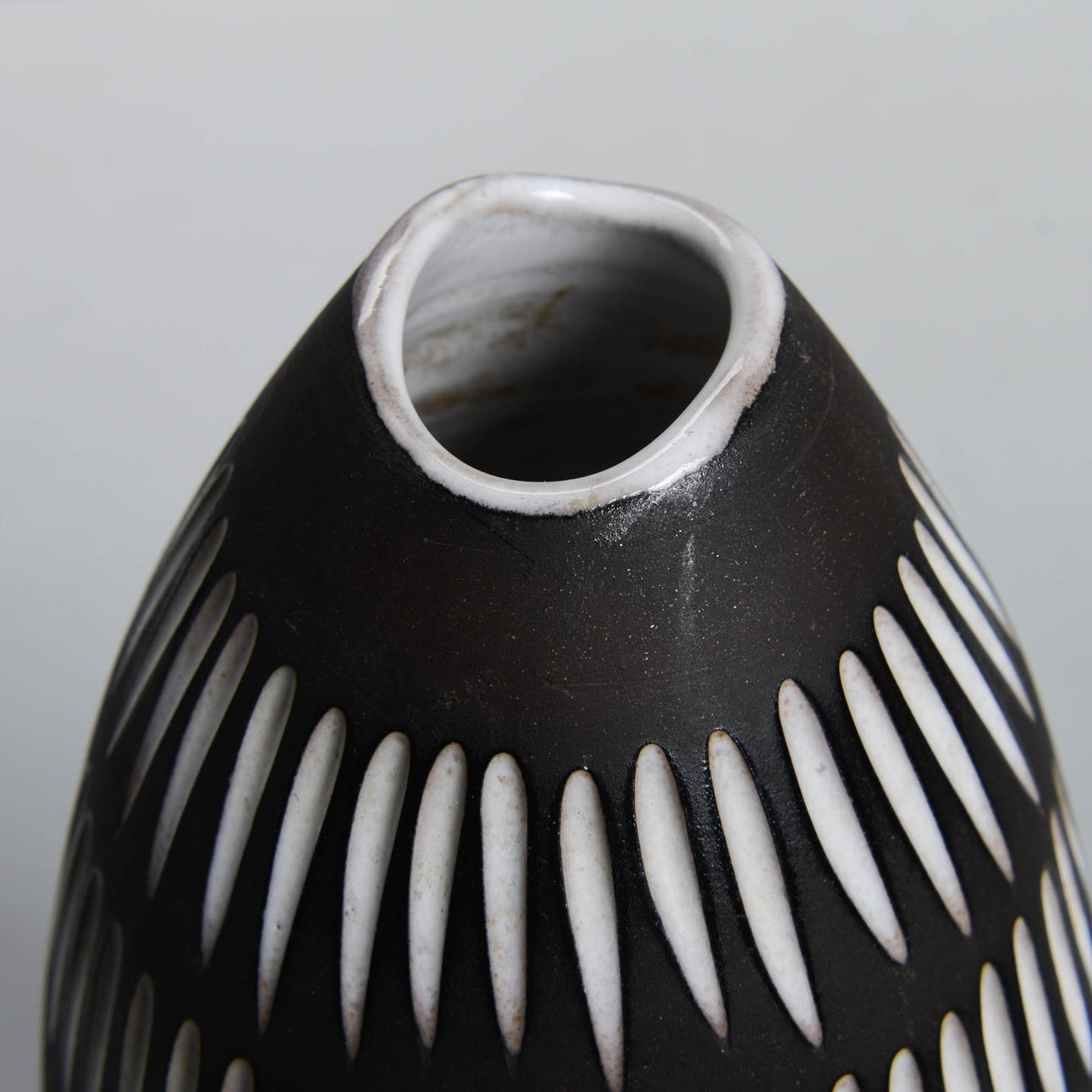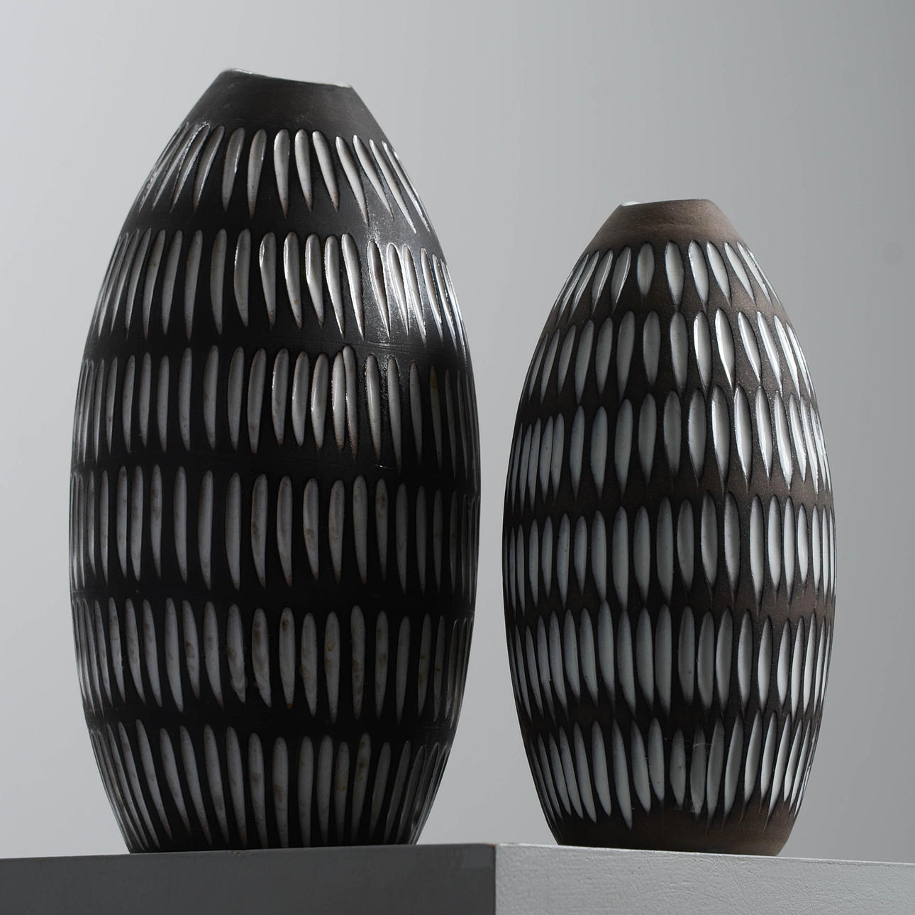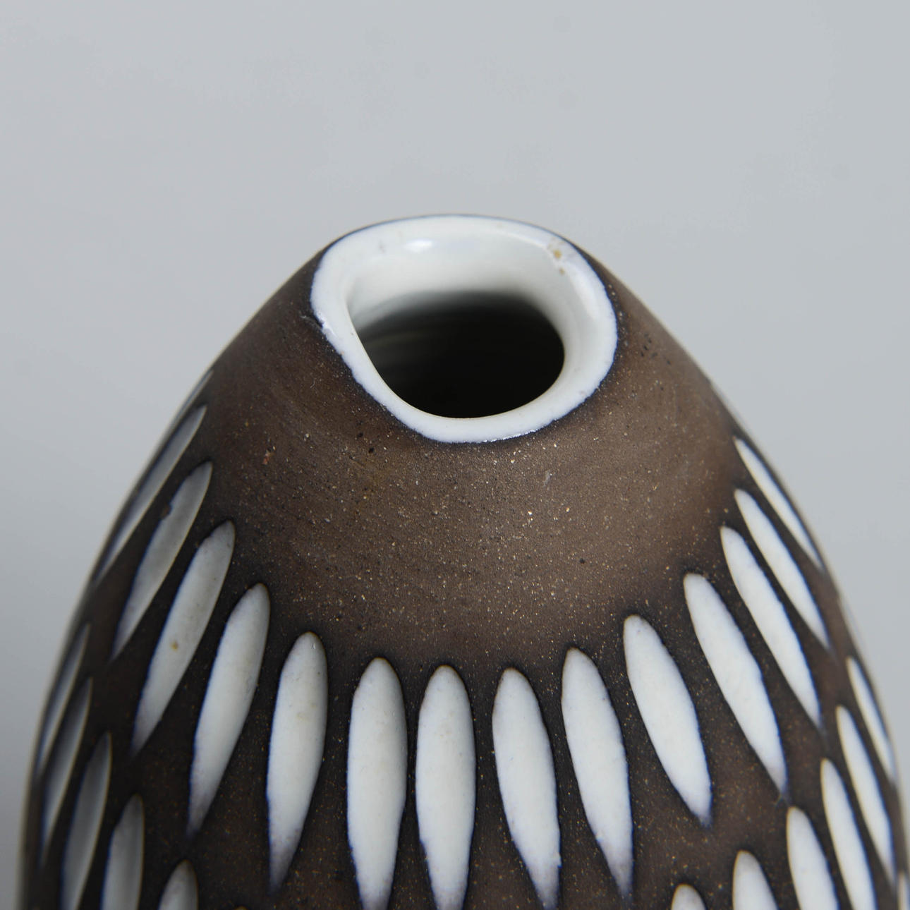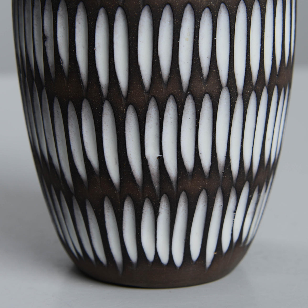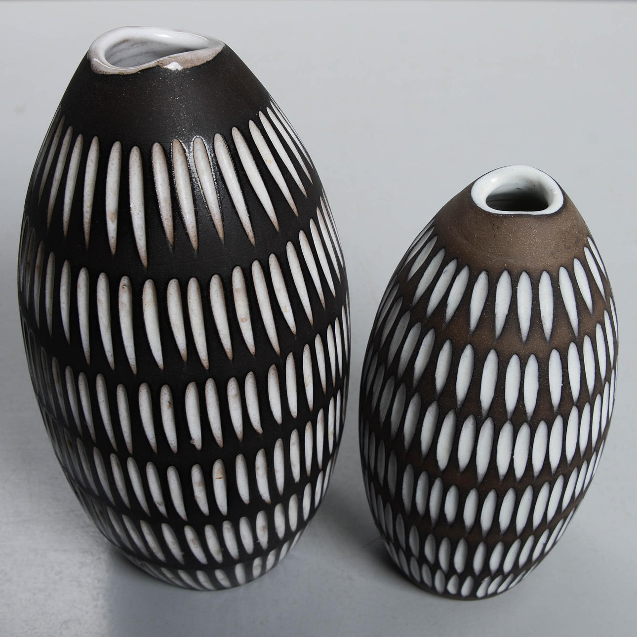 Bakgrund: Den av formgivarna på Upsala-Ekeby som var närmast leran, materialet, var Ingrid Atterberg (1920-2008). Hon experimenterade alltifrån första början, som den skolade keramiker hon var, med leror, glasyrer och tekniker. Till exempel återupplivade hon svartleran, en blandning av rödlera och manganoxid, och gjorde den till ett effektfullt inslag i många konstgodsserier, inte bara hennes egna; hon fick också fram en serie, Sintergods, som lyckades frambringa stengodseffekter ur den uppländska leran; hon hittade även på ett sätt att använda sig av chamottelerans effekter utan att behöva dreja den.