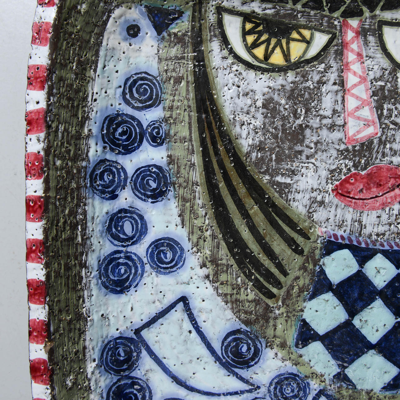Chamotterat lergods med målat motiv av kvinna och 2 fåglar (dekor B). 32 x 32 cm.