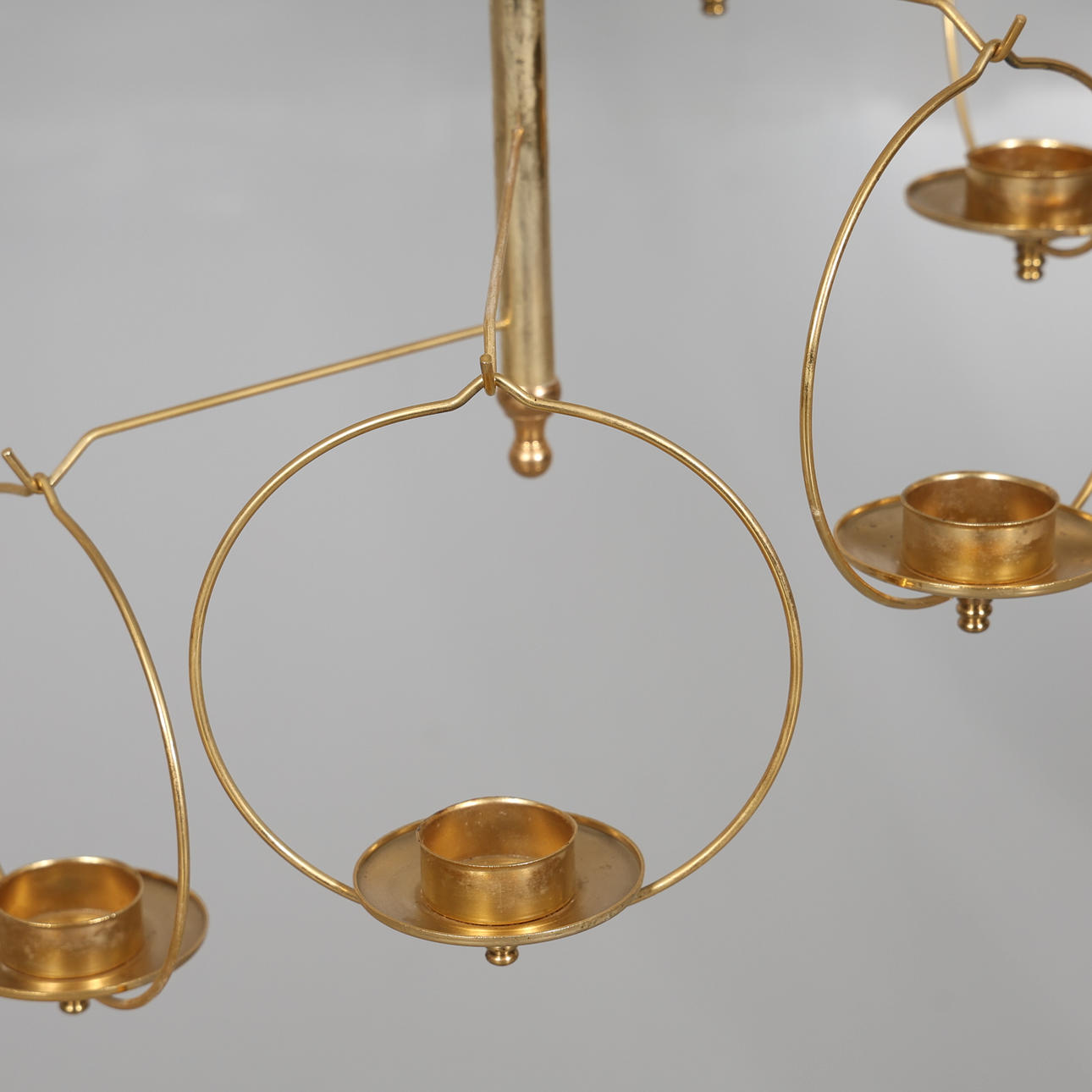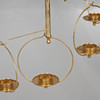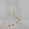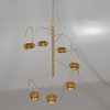 Mobil i mässing med sju ljushållare samt centralt placerad stomme. 9 tillhörande upphängnings länkar i mässing medföljer (vardera 33 cm). diameter ca 35 cm, höjd exkl upphängningslänkar ca 60 cm.