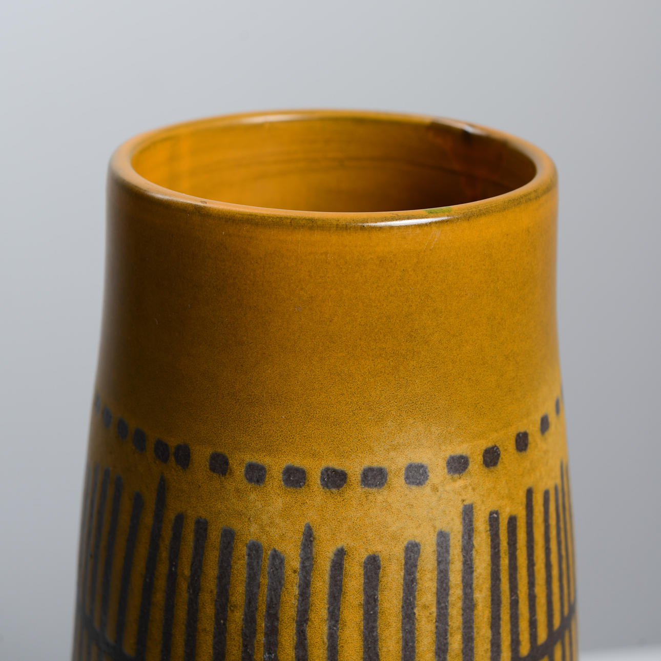 Bakgrund: När Göran Andersson (1935-89) övergav keramiken för en karriär som scenograf var det en och annan som fällde en tår. För det han skapade under sina år på Upsala-Ekeby 1960-67 visade prov på sällsynt känsla för keramikens uttrycksmedel. Hans dekorativa talang syntes i konstgodsserierna, ofta i raffinerat enkla abstrakta mönster, med ristade och/eller målade svarta streck och linjer mot enfärgad botten, medan hans ibland dråpligt humoristiska djurfiguriner visade att han också kunde skulptera och forma.