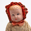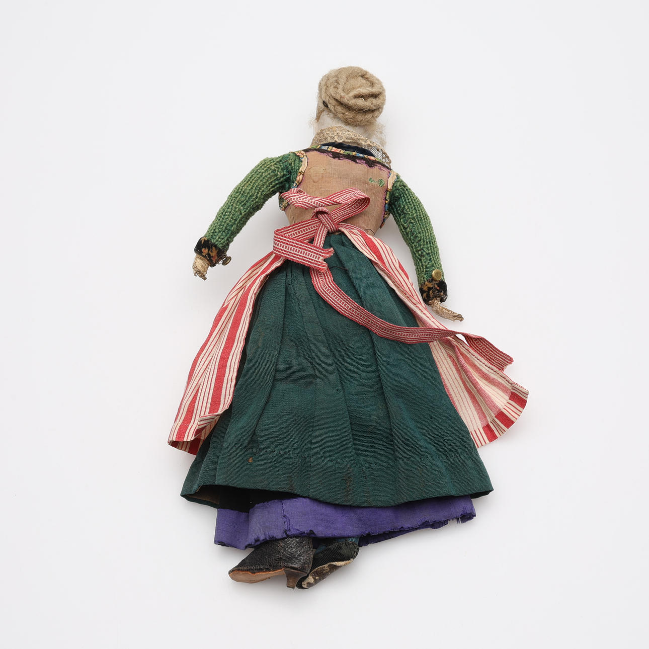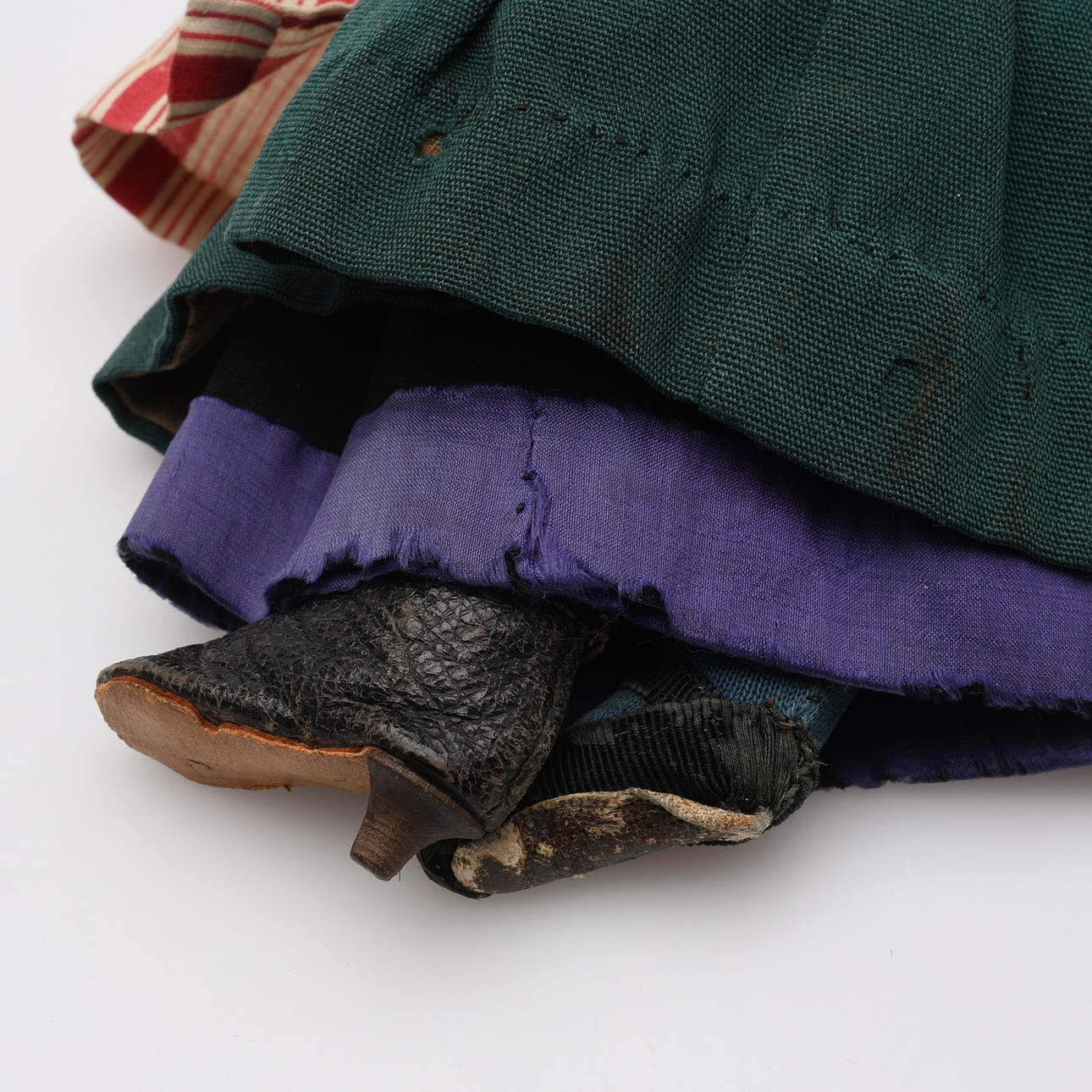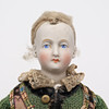 Docka med biskvihuvud och tygkropp, 1800-talets andra hälft, enligt uppgift tillverkad i Lund, höjd 31,5 cm.