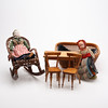 Bruks- och åldersrelaterat slitage. 1 sko saknas dockan. Rotting med slitage.