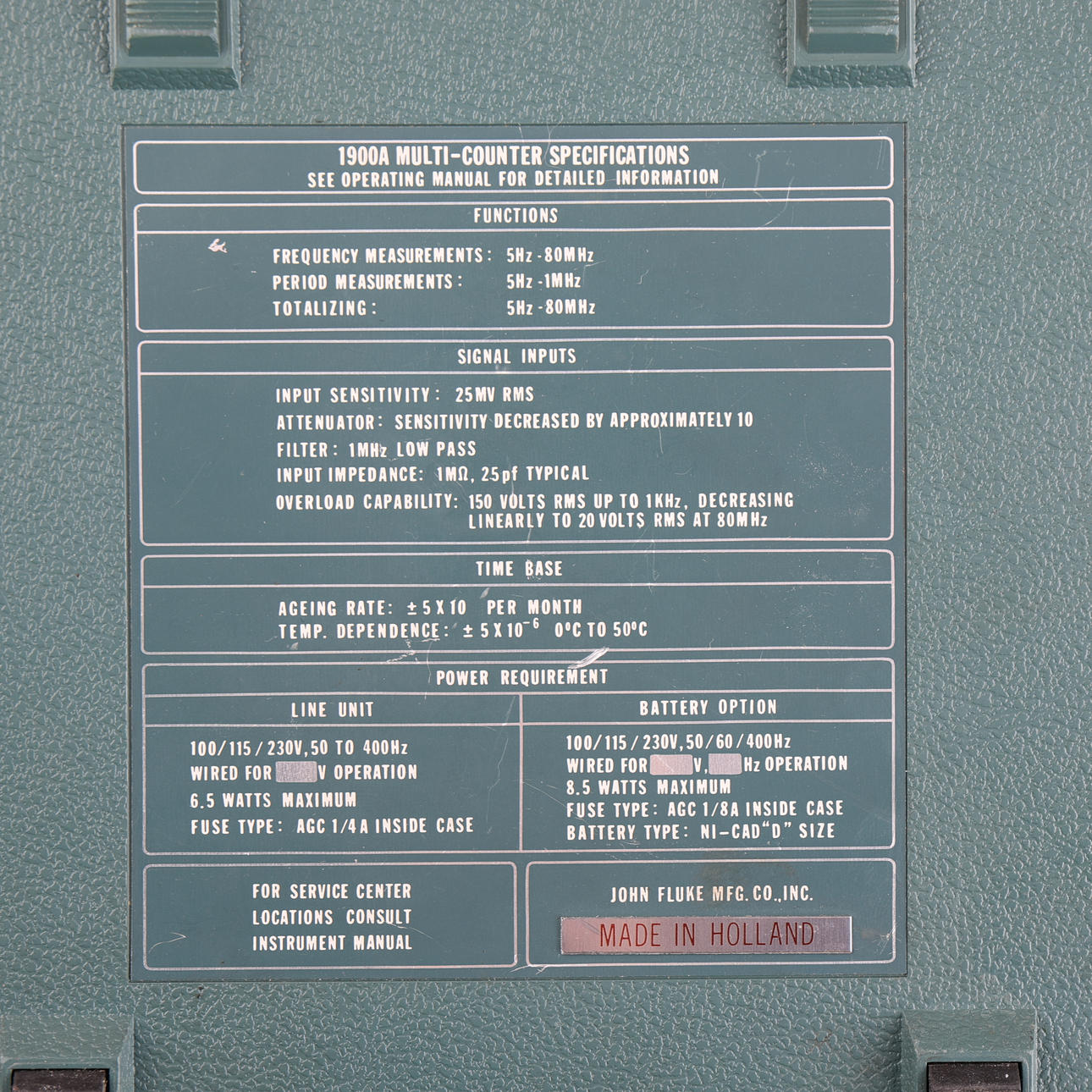 Fluke 1900A Multi-Counter är en klassisk, numera utgången, multifunktionsräknare designad för mätning av frekvens, periodtid, periodtidsmedelvärde och pulssummering (totalize). Den har ett specificerat frekvensområde från 5 Hz till 80 MHz.