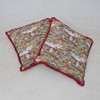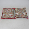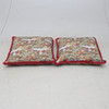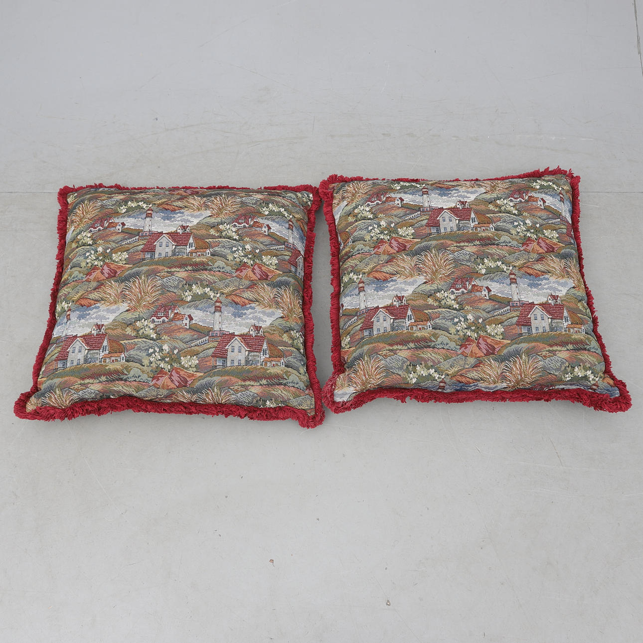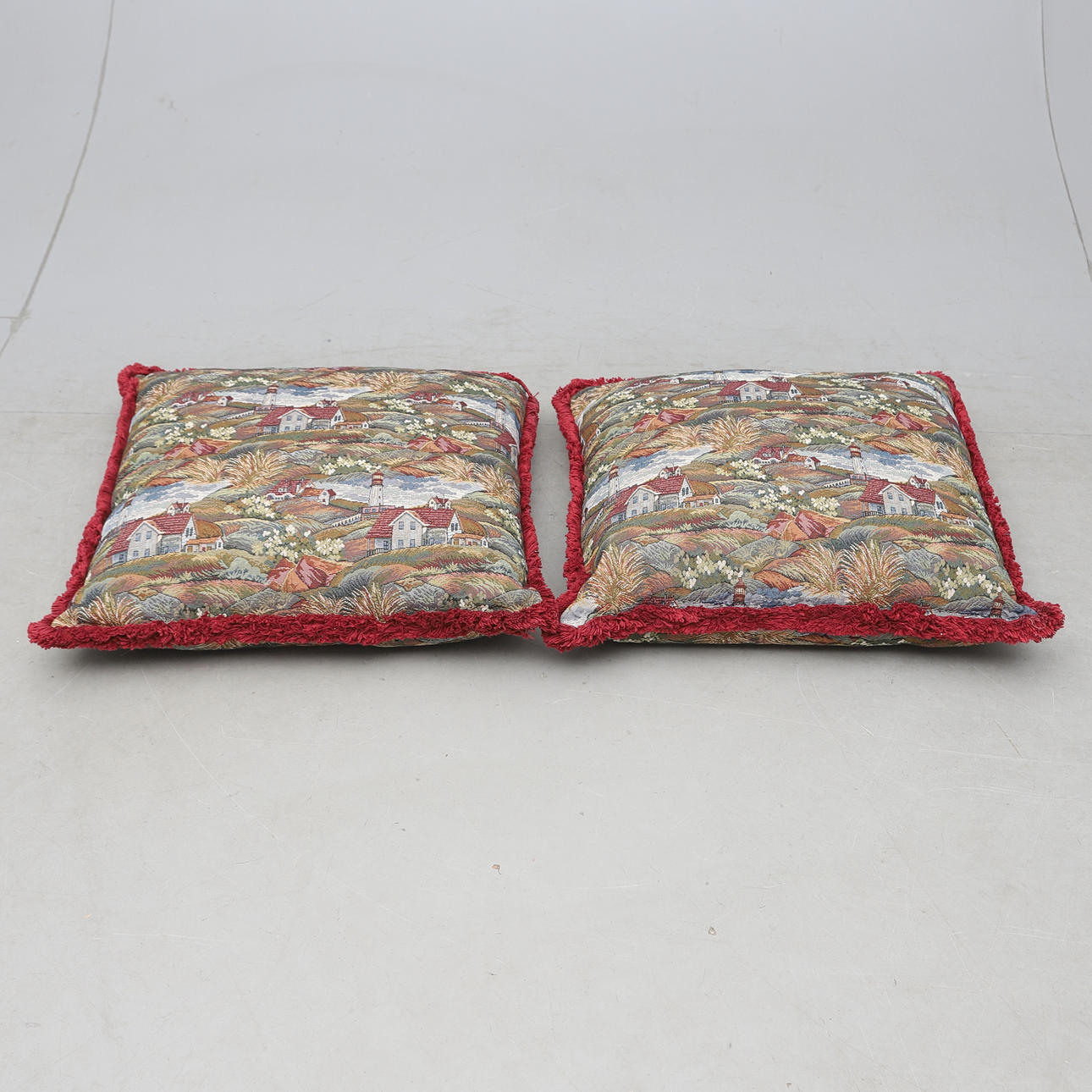 2 st kuddar "braskuddar", textil med landskapsmotiv.