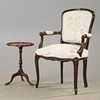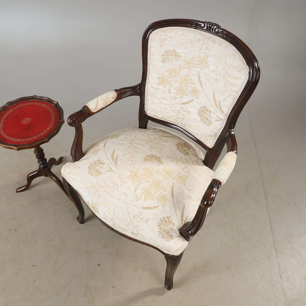 Fåtöljens längd 63, bredd 48, sitthöjd 48, höjd 94 cm.