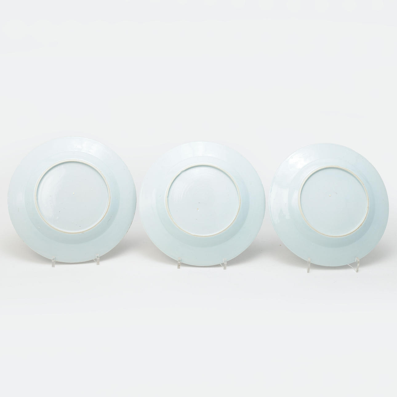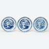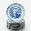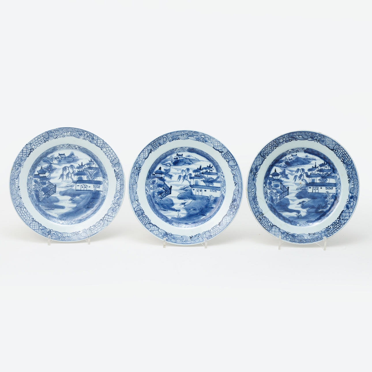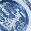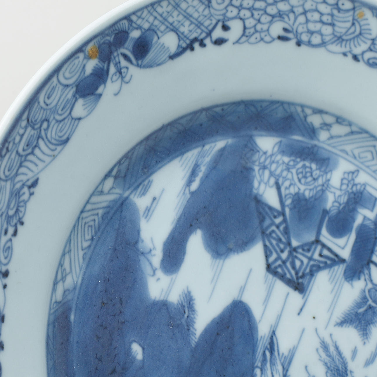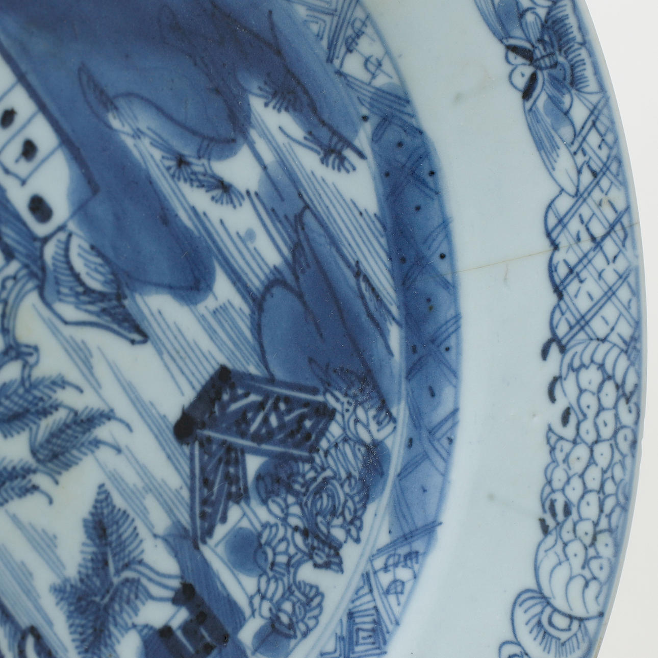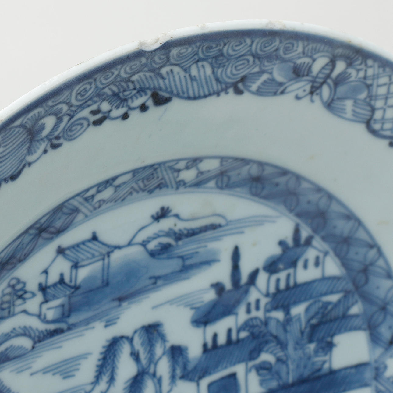 Dekor i underglasyrblått av pagoder, diameter ca 23-23,5 cm.
