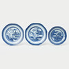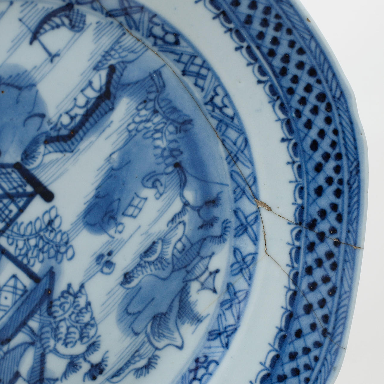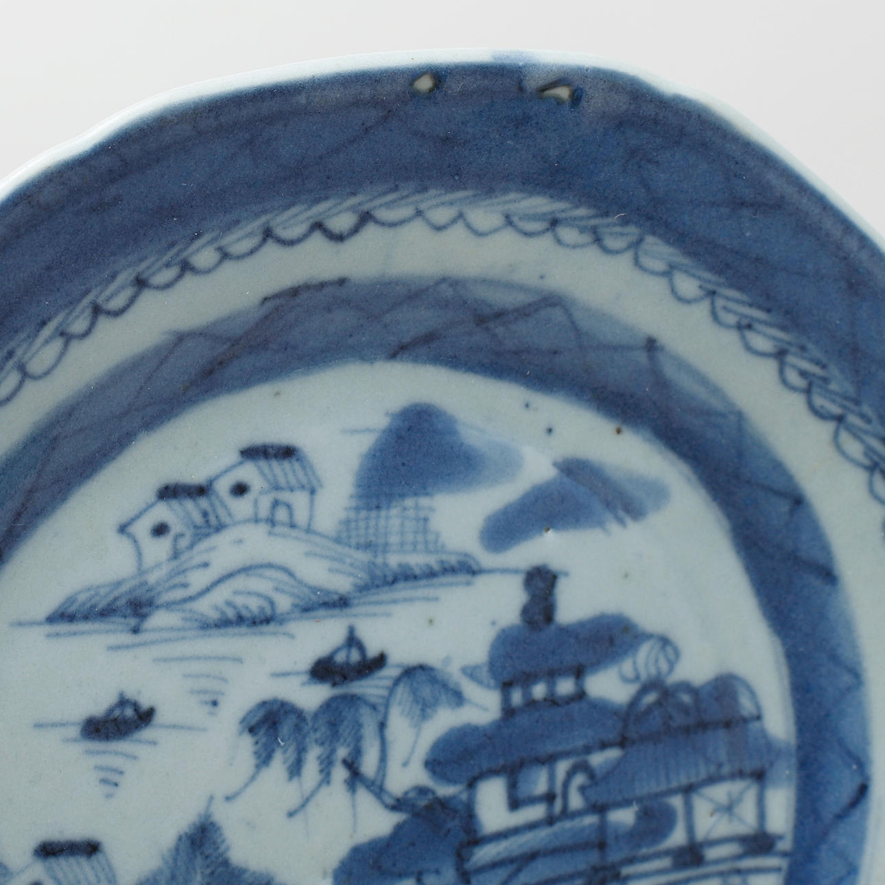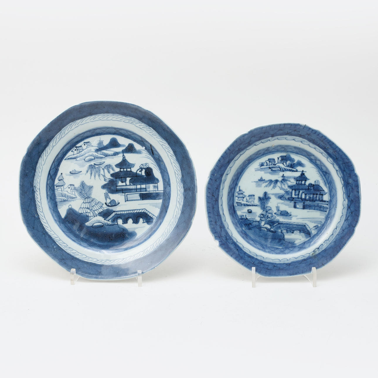 Dekor i underglasyrblått av pagoder. Diameter ca 19-23 cm.