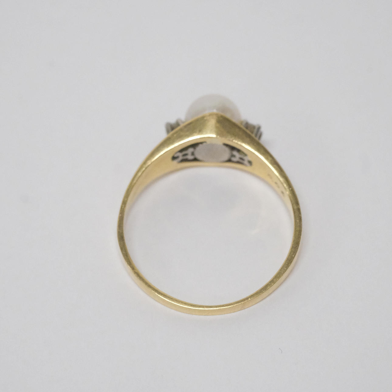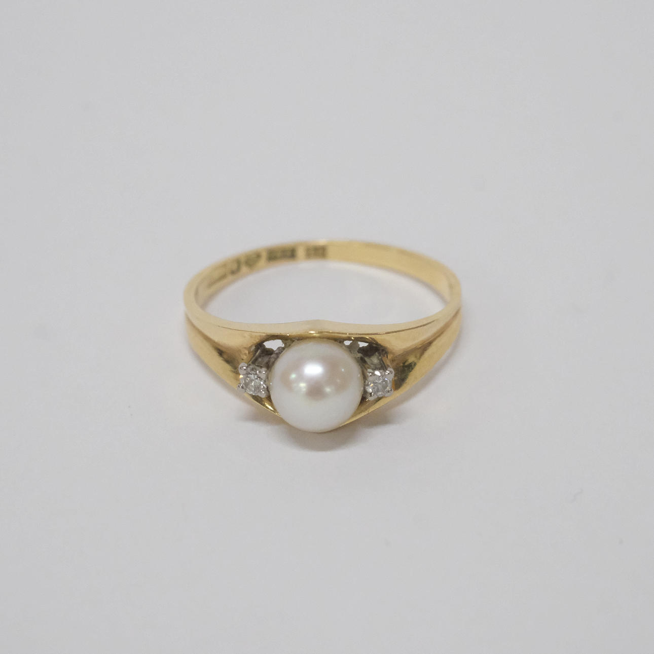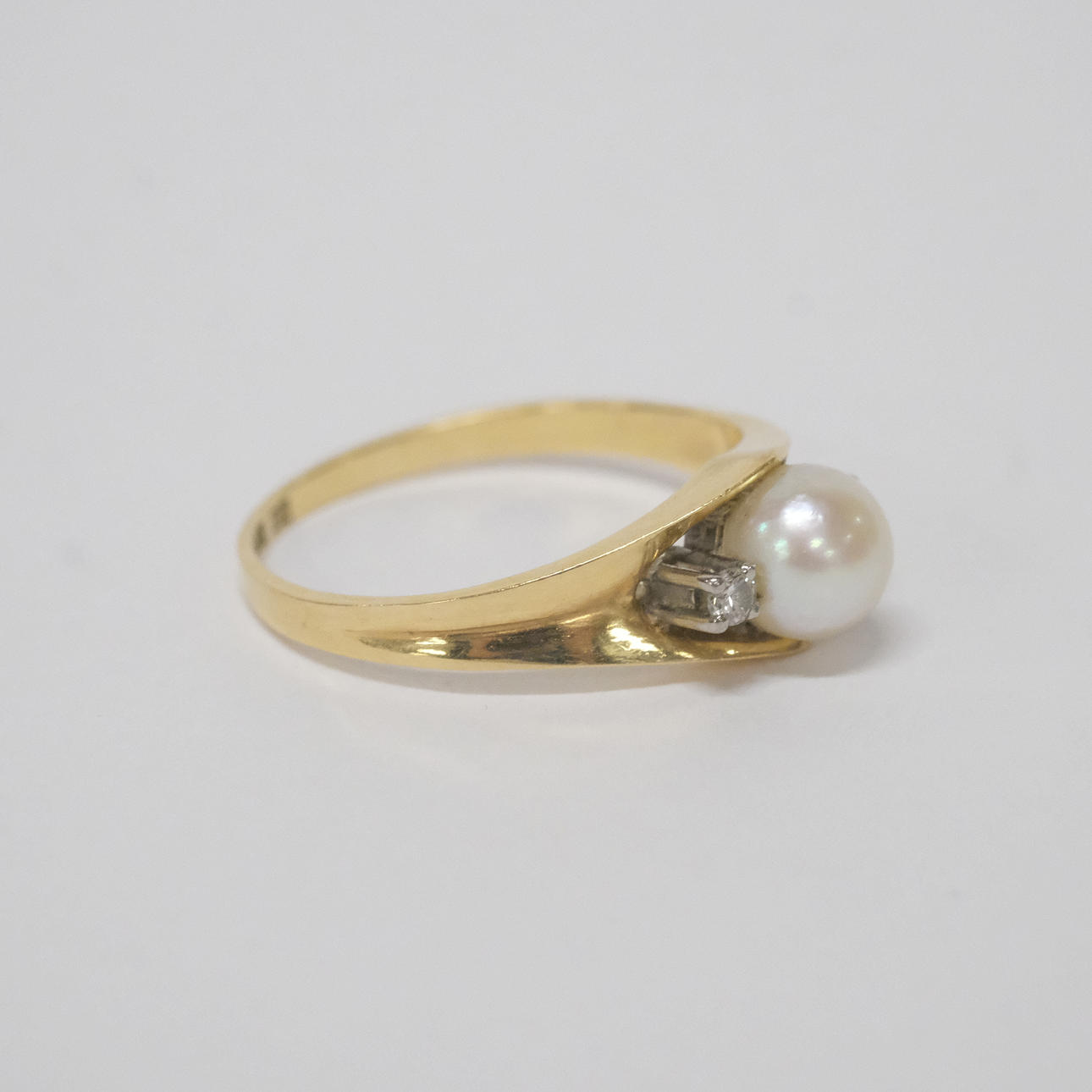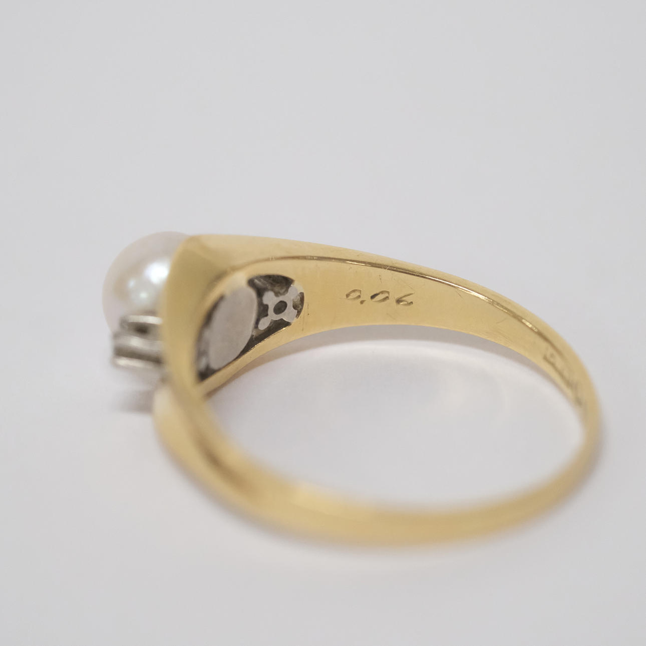Två diamanter, totalt 0,06ct samt pärla, diameter ca 6mm. Stockholm 1961. Total vikt ca 2,7 gram.
