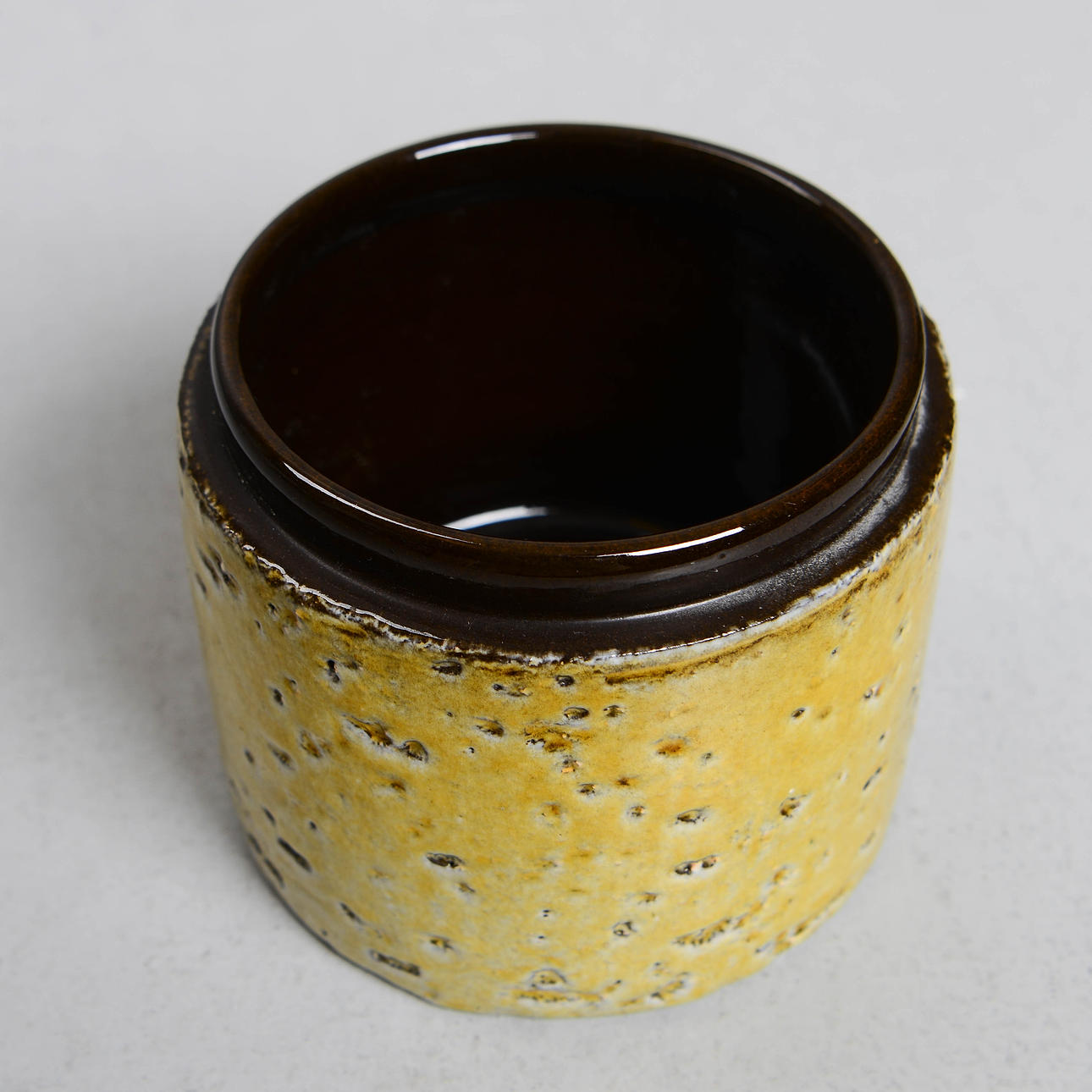 Ovanligt. Delvis chamotterat lergods. Diameter 11 cm. Höjd 9,5 cm.