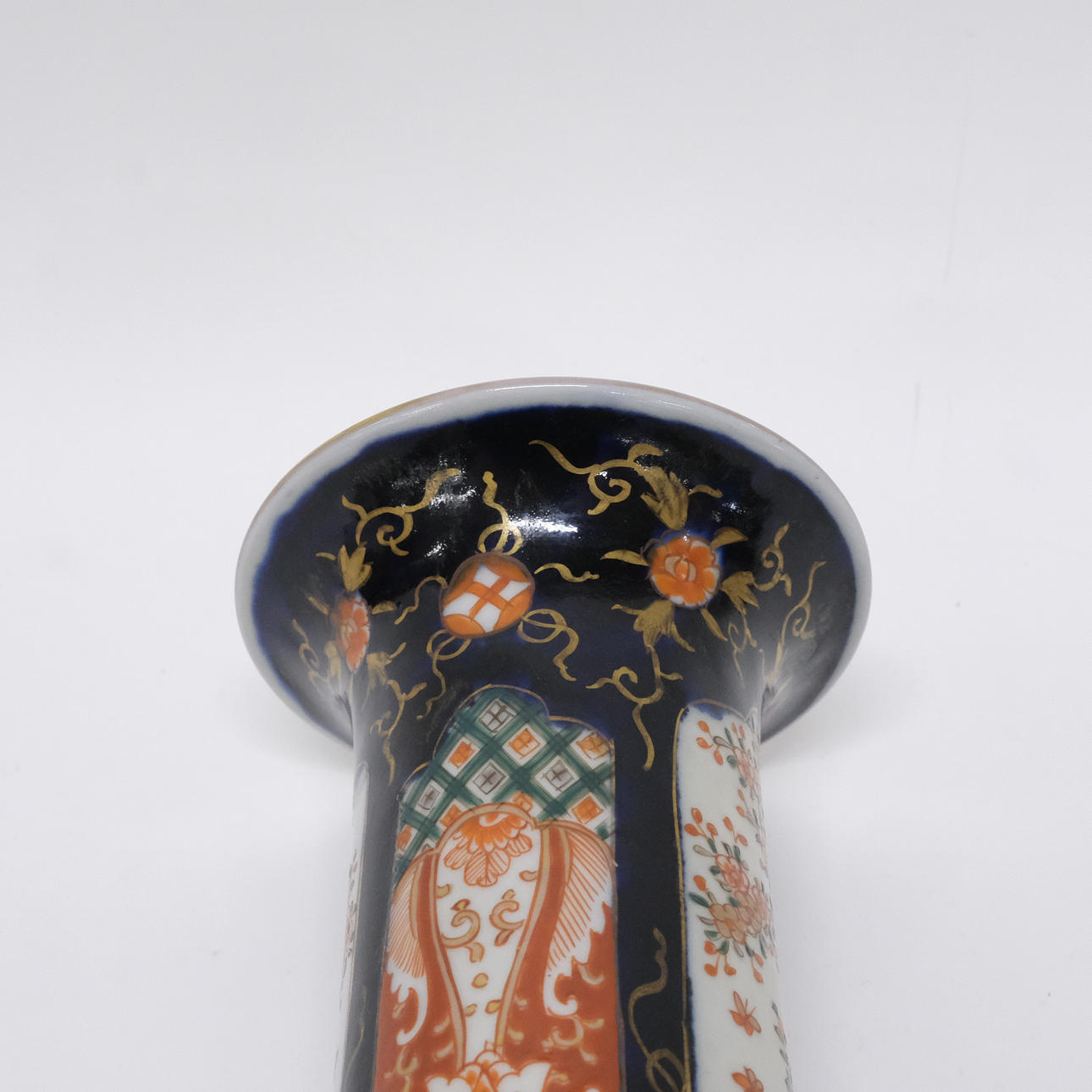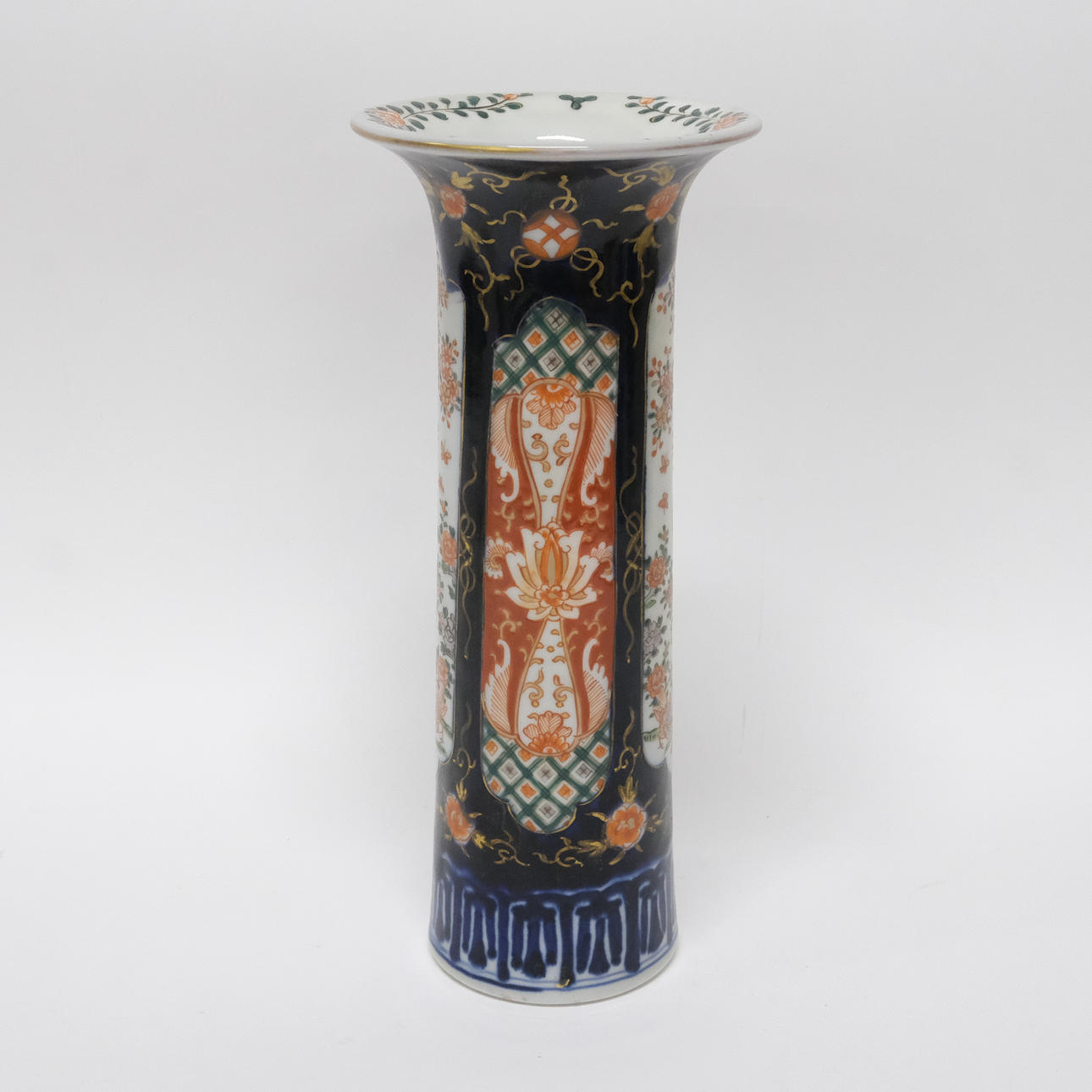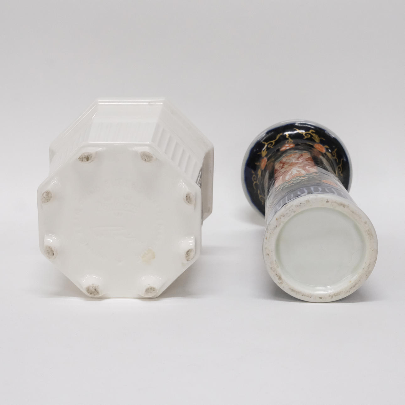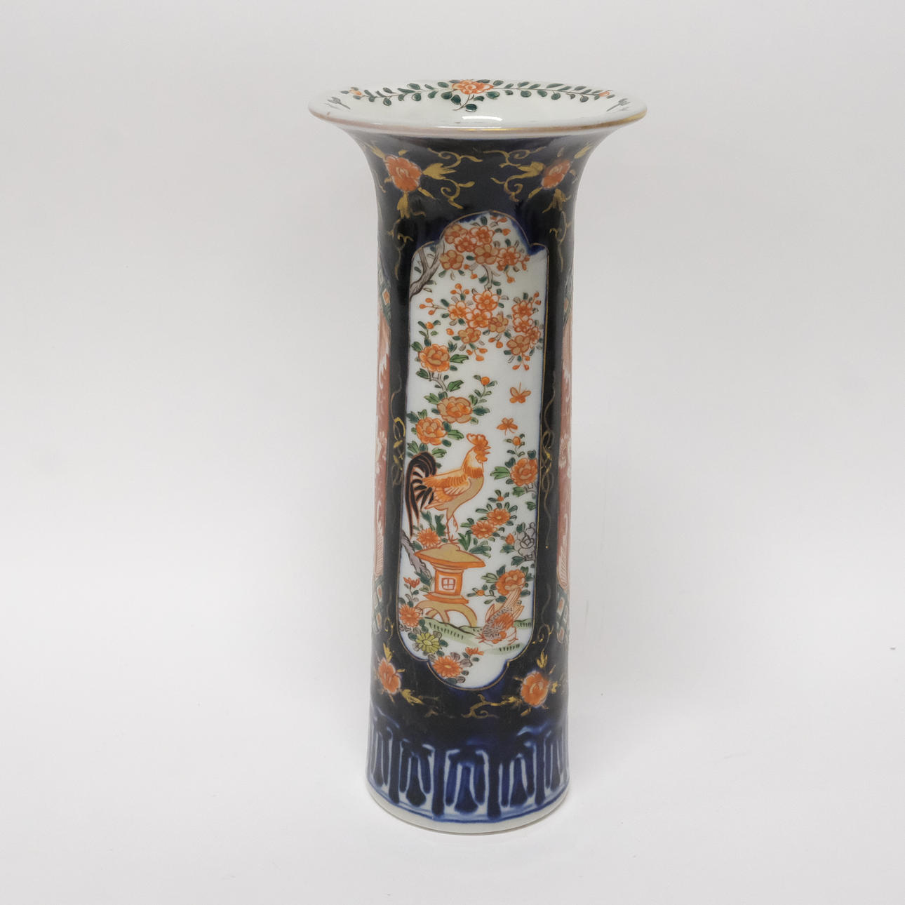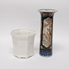 Vas, motiv i med bl.a blommor, tuppar, i rött och blått, höjd 29 cm. Prins Eugen ytterfoder Waldemarsudde, höjd 15,5 cm, diameter 15 cm.