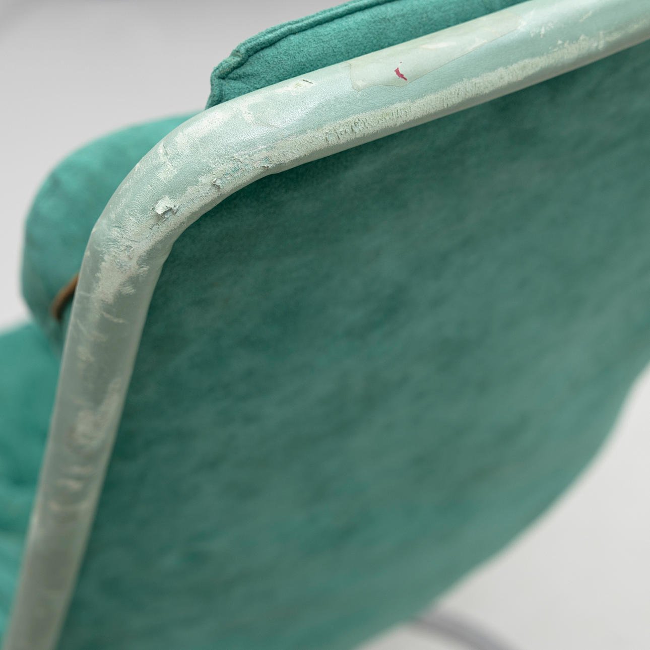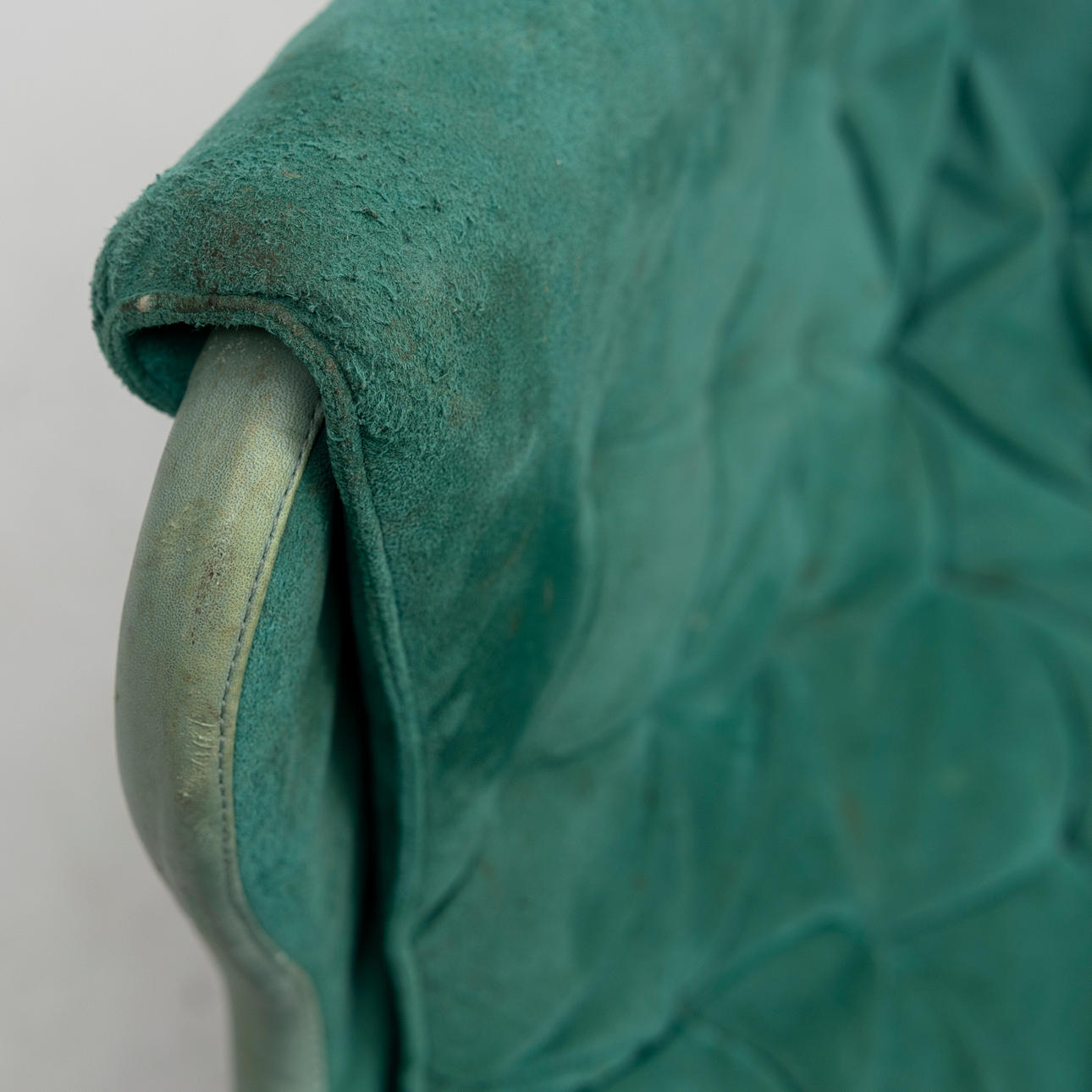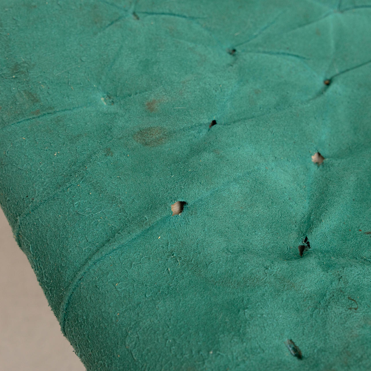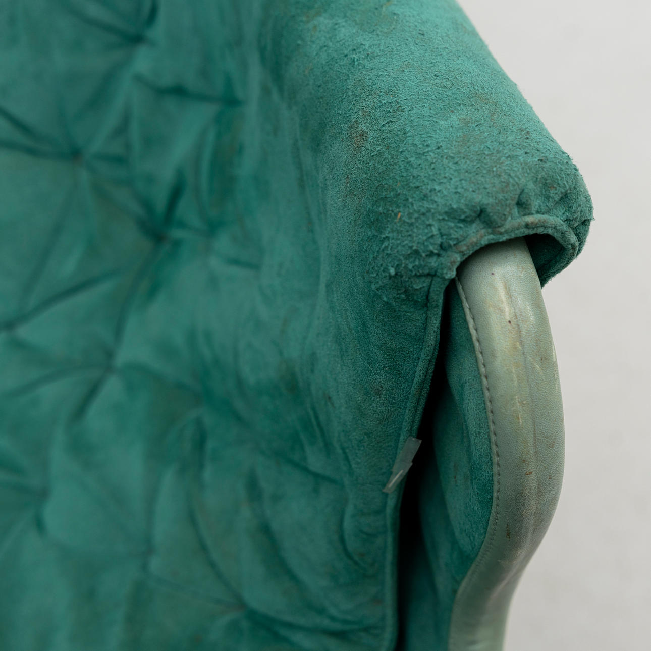 Stomme med läderklädda kanter, kromad fot. Sittdyna och nackkudde i grön mocka. Sitthöjd ca 42, rygghöjd ca 99 cm.