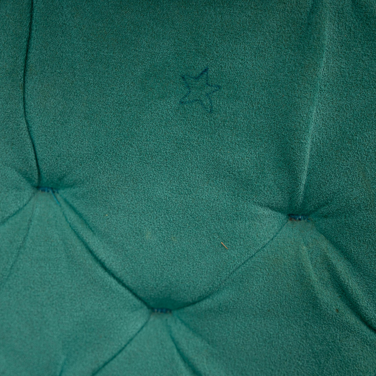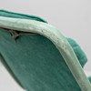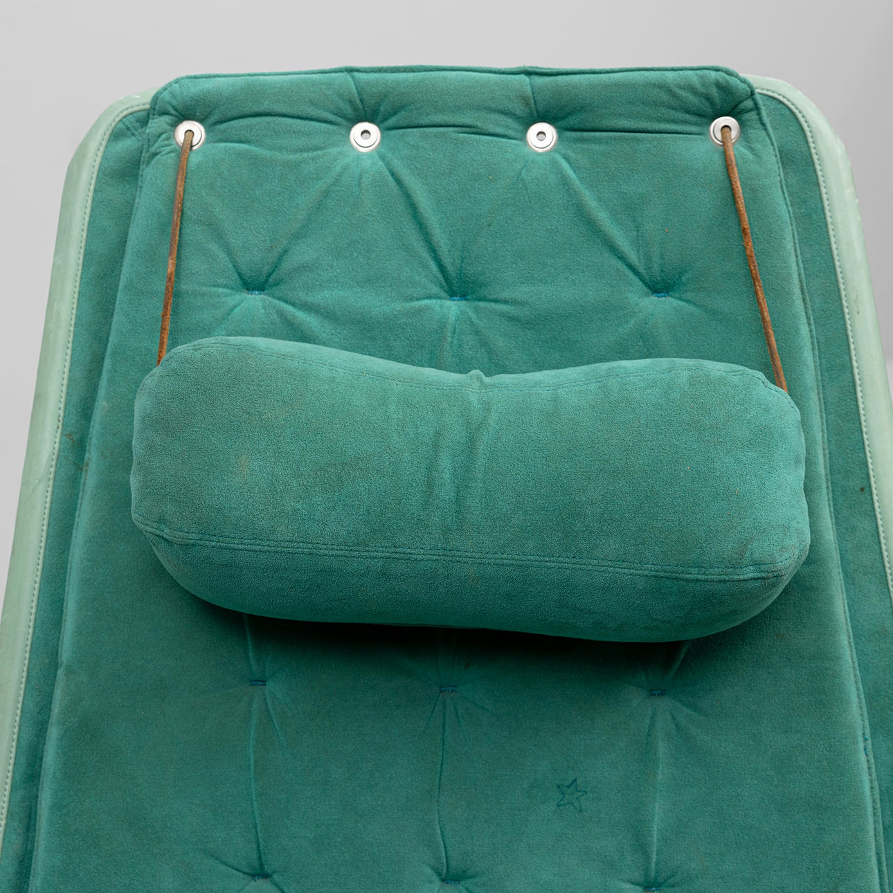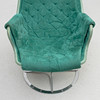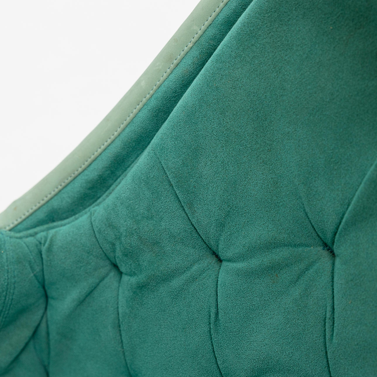 Stomme med läderklädda kanter, kromad fot. Sittdyna och nackkudde i grön mocka. Sitthöjd ca 42, rygghöjd ca 99 cm.
